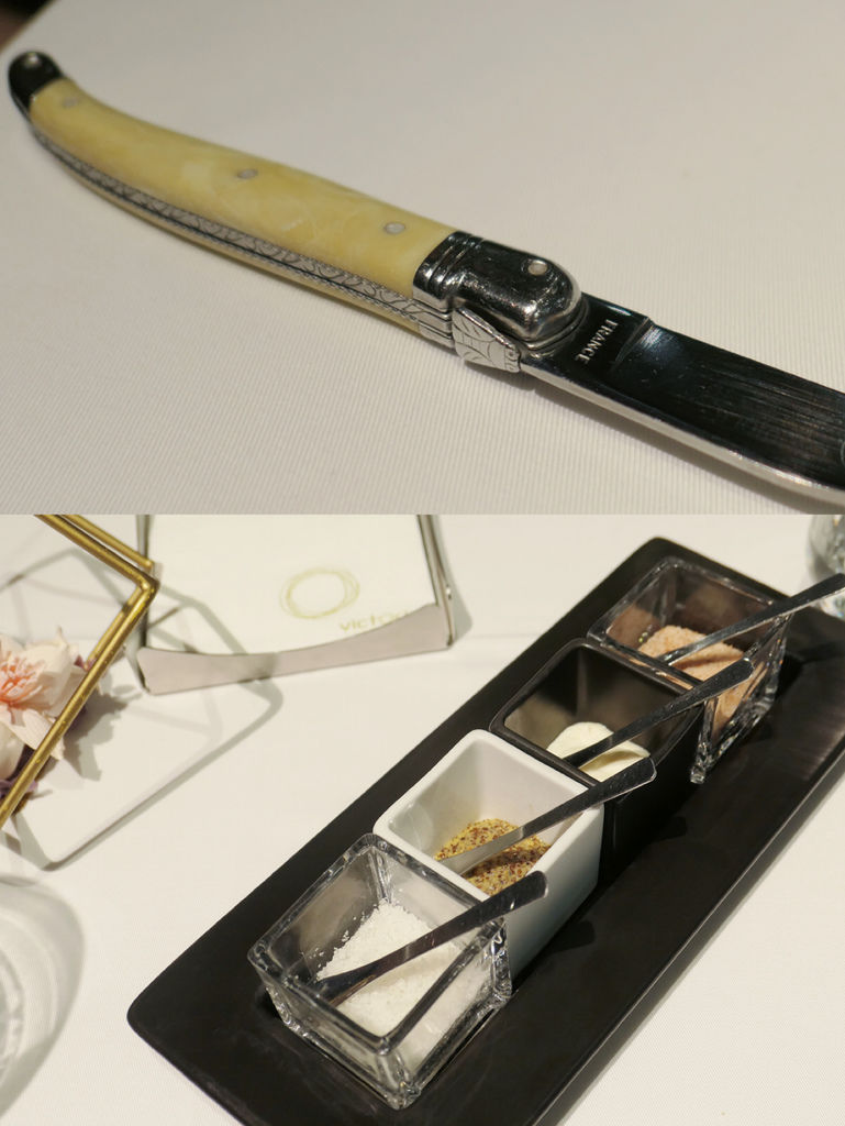 搭配牛排的醬料有法式芥末籽、喜馬拉雅玫瑰鹽、法國鹽之花及芥末醬。而牛排刀則是使用法國刀具名牌Laguiole。