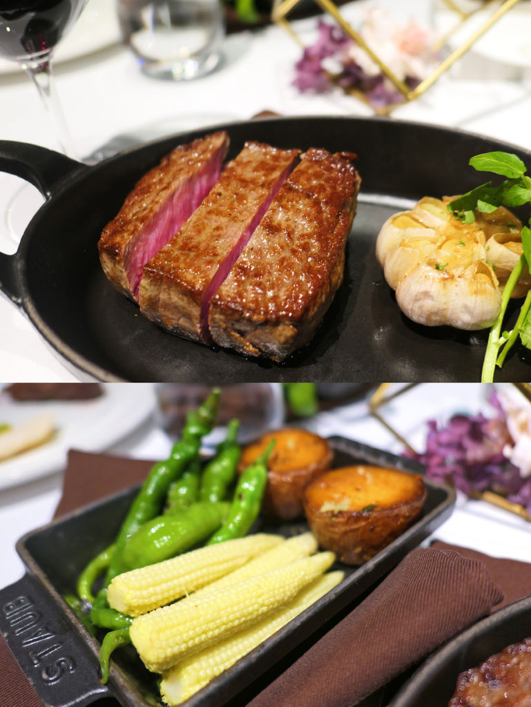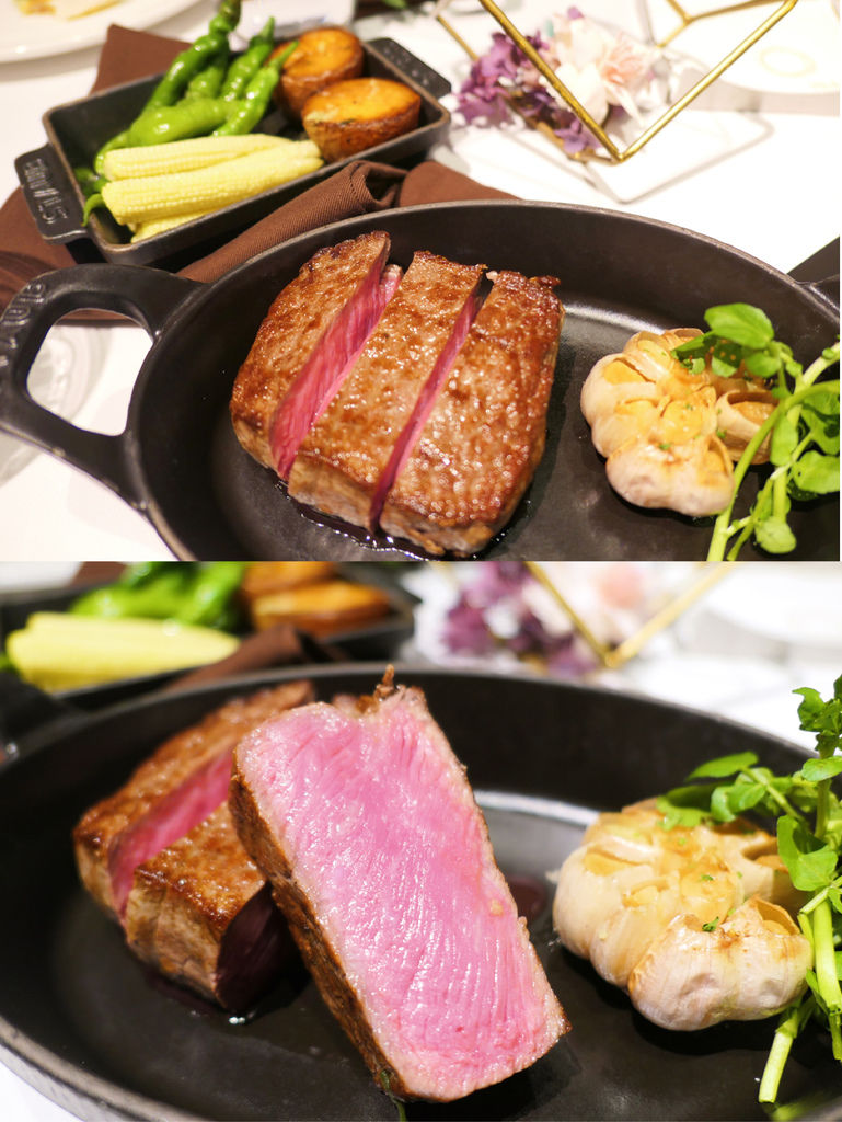 除了主餐牛排之外,一旁還有附上烤大蒜及季節時蔬(照片為雙人份),可以轉換口味及口感。