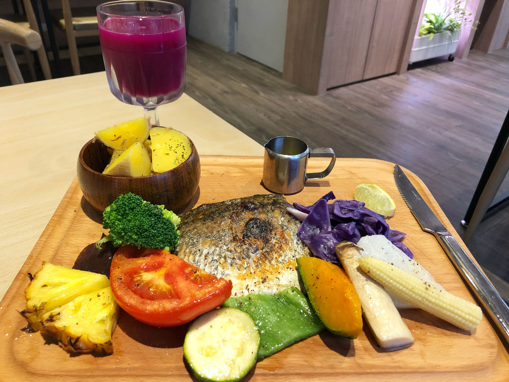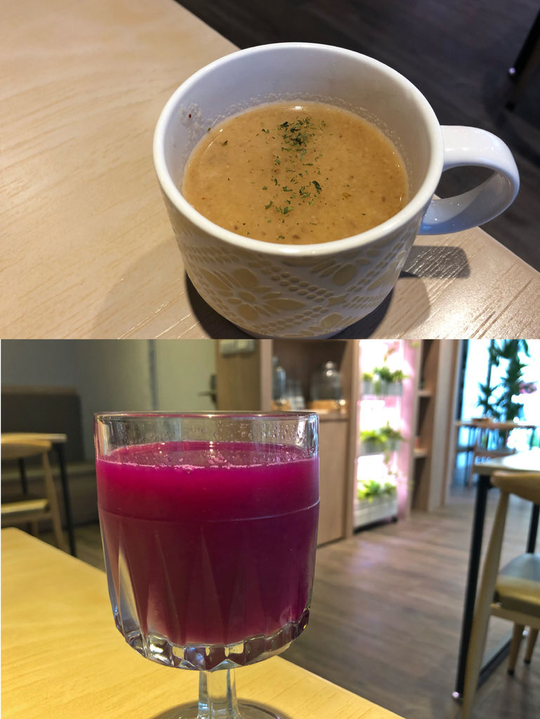 由於餐點搭配飲品有優惠,所以選擇了每日綜合果汁,當天是火龍果、芭樂、蘋果,沒有額外加糖,僅有水果本身的甜味,或許會有人喝不慣,但我個人滿喜歡。