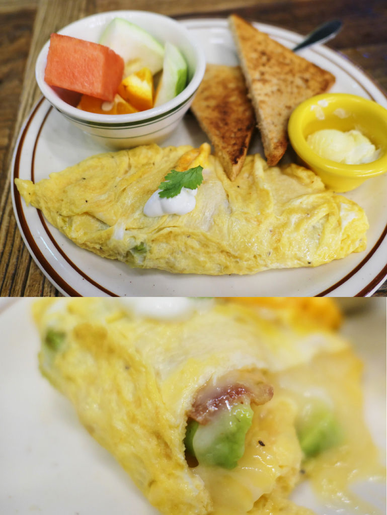這道加州蛋捲上桌絲毫沒有令我食指大動的感覺,焦黑乾硬的麵包,與一旁隨意擺放的水果,細緻度顯得不足。
