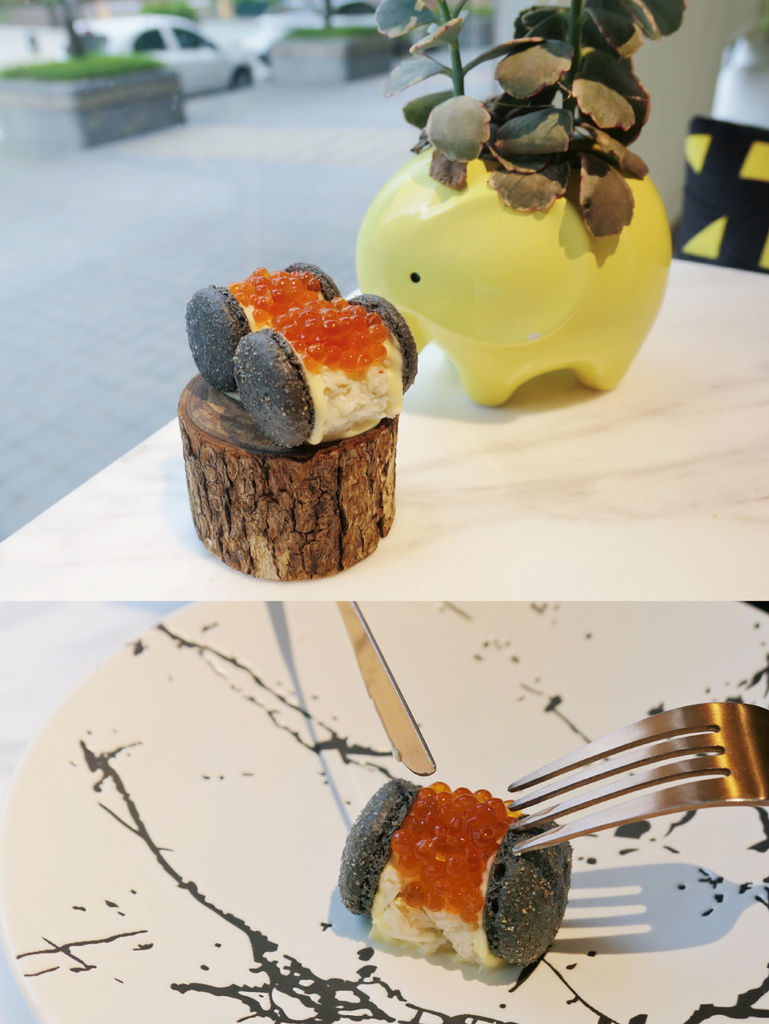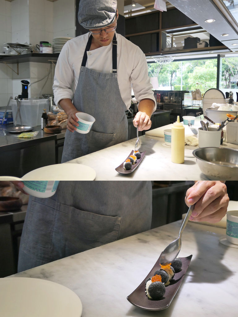 這道創意料理挺令我驚豔的,雖一顆要價近百元,但其實一顆知名馬卡龍價格就差不多,更何況裡頭還有夾餡。