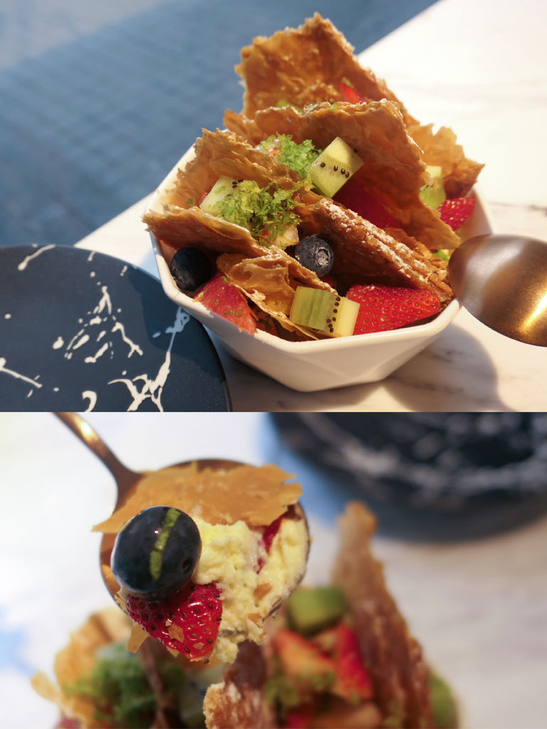 下方的起司有種卡士達奶油的錯覺,帶酸度的水果中和了甜膩,增添了清爽度,薄荷則增添口腔中的草本清香。