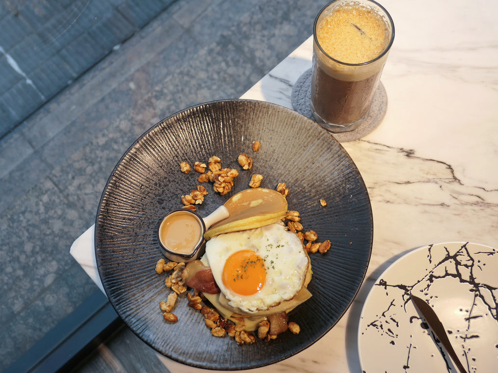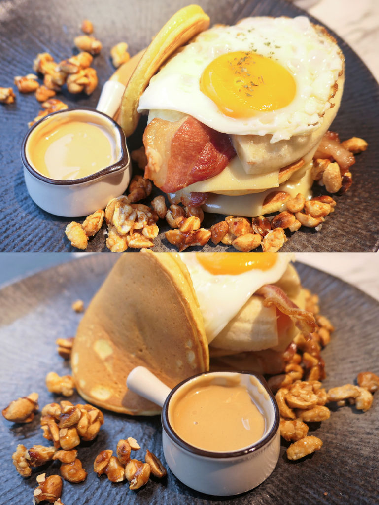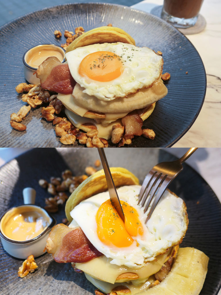 半熟蛋一切下,蛋黃傾瀉而出,混合著起司、培根、香蕉,一口吃下甜鹹交錯,好是滿足。