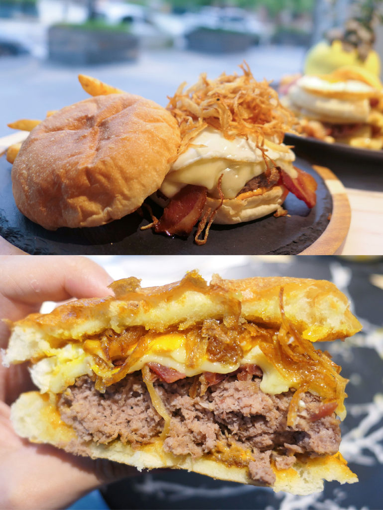 而搭配漢堡肉的,是帶點辣度的咖哩美乃滋、鹹香培根、荷包蛋及淡淡奶味的埃德姆起司,最上頭的炸洋蔥更是甜味的主要來源。