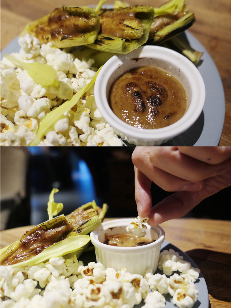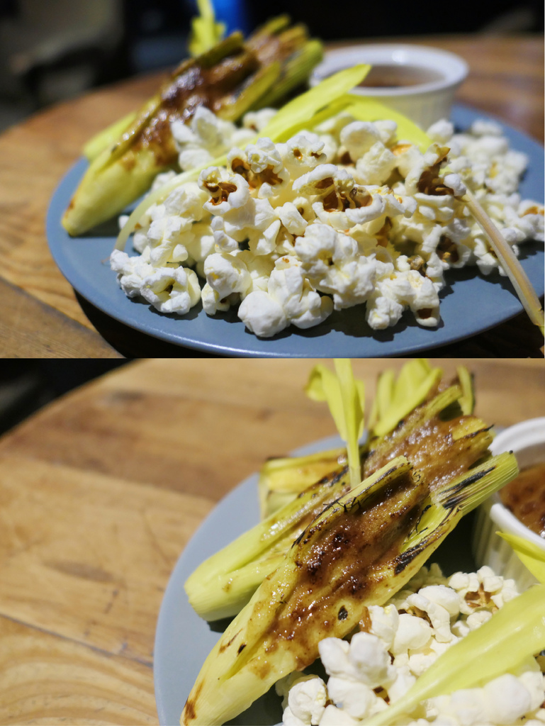 分別是燒番麥版本的烤玉米筍、爆米花、以及玉米芽,一旁的醬汁更是超有特色,每一樣都是絕佳的搭酒小點。