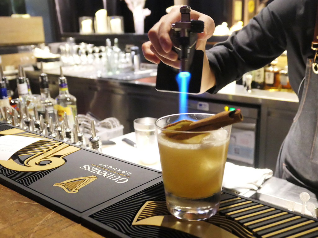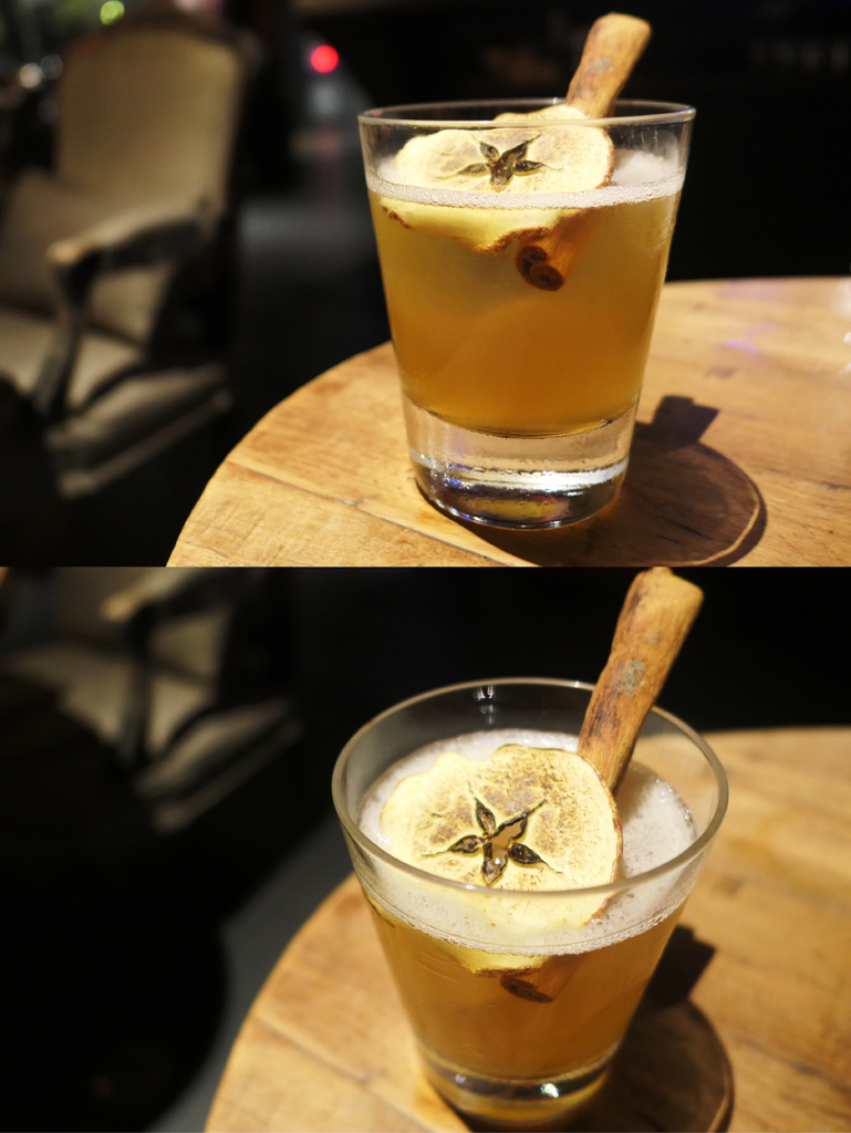 以噴槍炙燒過的蘋果片與肉桂,散發淡淡的煙燻香氣。