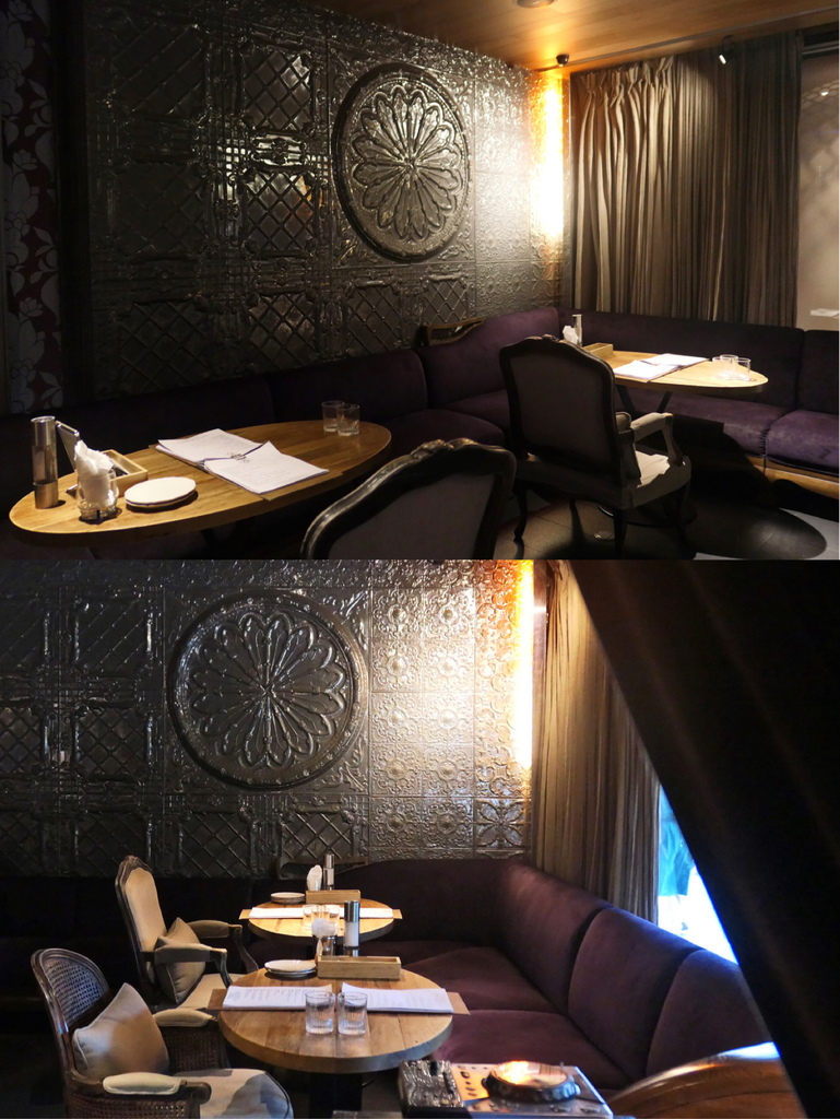 而貴氣紫色絨布沙發、歐風傢俱和布簾,與華麗的霓虹燈飾,則又拉回了西式摩登風。