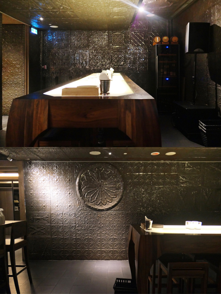 天花板與壁面皆採用大量錫製雕飾,在光線折射下閃耀神秘的暗色光澤,呈現中式古典風格。