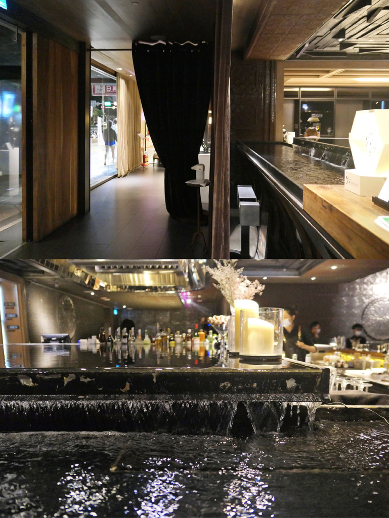 走進大門,左方是「HOTEL QUOTE Taipei」櫃檯,右手邊才是「333 Restaurant & Bar」,前方的大型水景吧台像是分水嶺般,帶領客人前往他們的目的地。