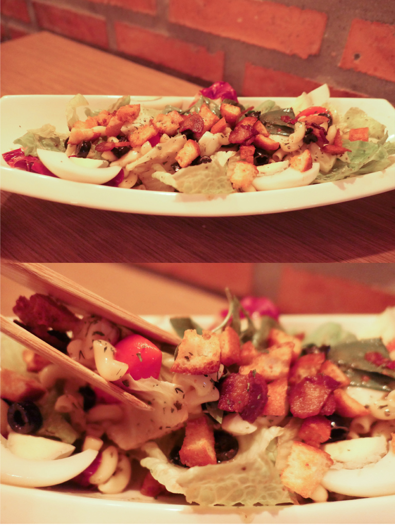 里昂沙拉內容物主要為新鮮蘿蔓,一旁還有培根、水煮蛋、通心粉及脆口的麵包丁,搭配橄欖等香料,整體微酸清爽,且由於有澱粉所以具有一定飽足感。