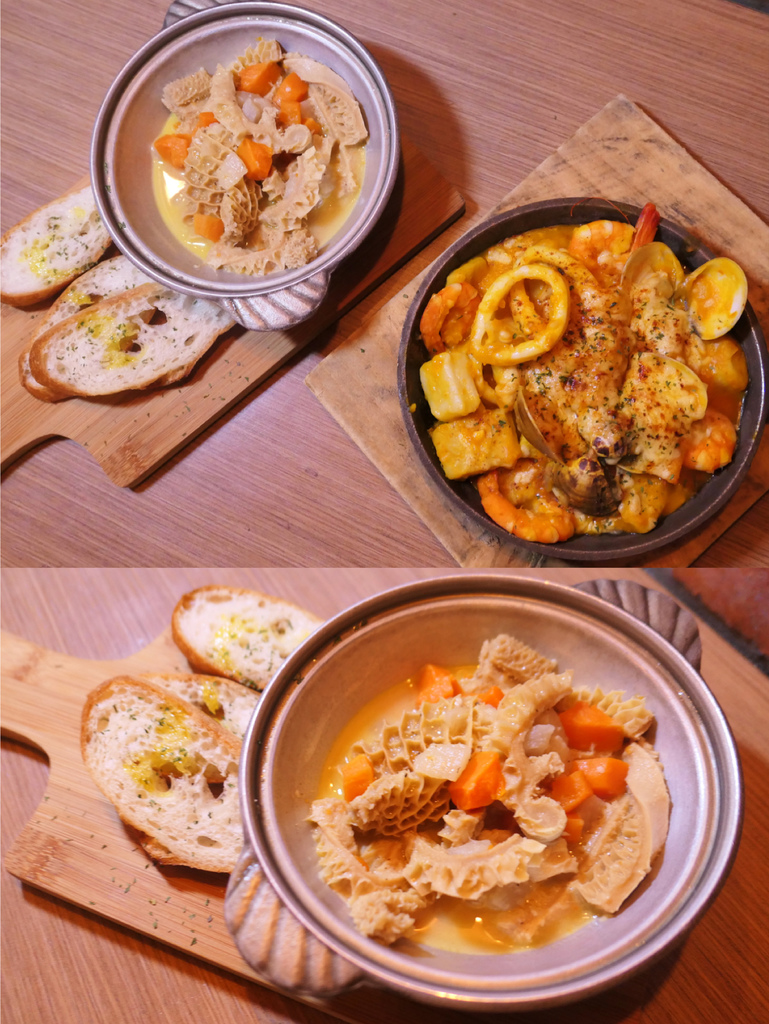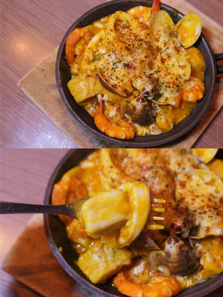 醬汁是使用溫順的南瓜泥,搭配新鮮的蛤蜊、鮮蝦、花枝,上頭再加上奶香起司烘烤,整體口味偏清淡好入口。