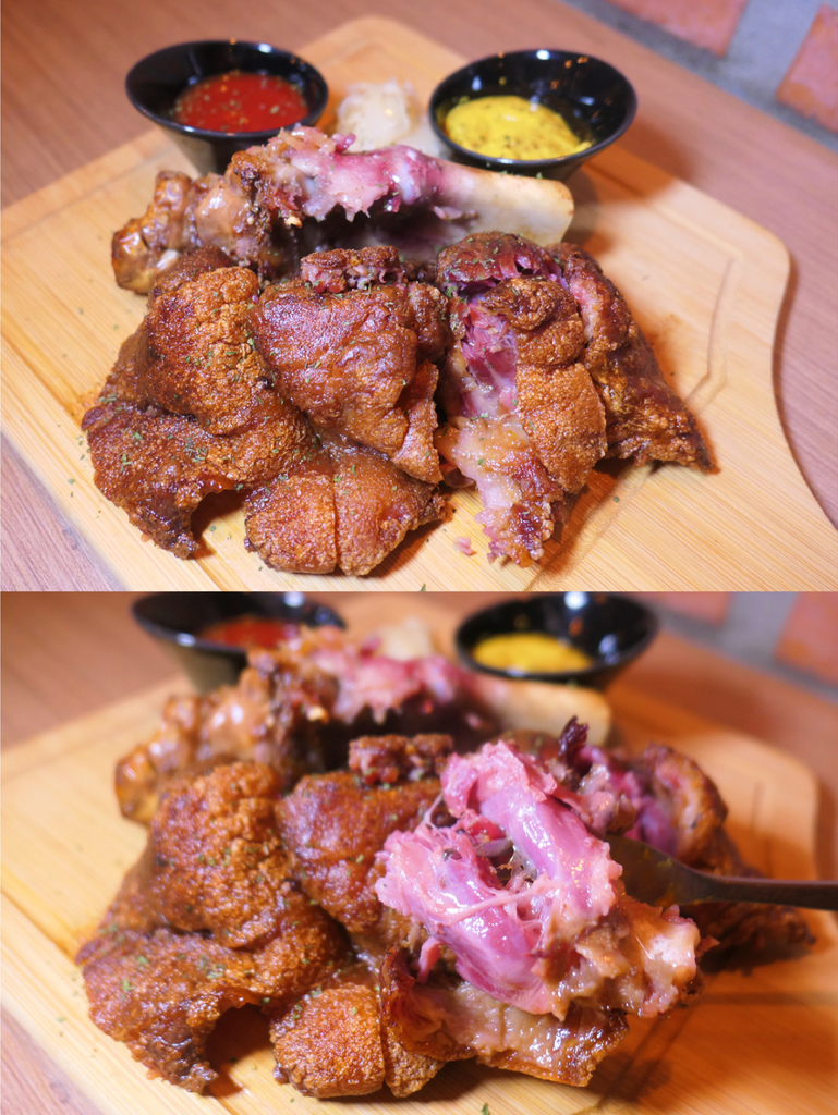 酥脆的爐烤外皮下,是軟嫩又Q彈的前蹄膀肉,由於事先有先滷製過,所以單吃就很有味道,當然沾芥末醬、番茄醬跟搭配店家自製酸菜也別有一番風味。