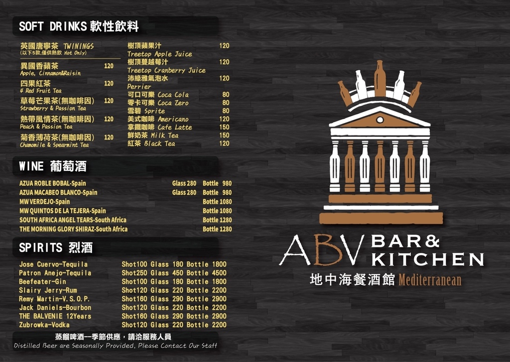 而「ABV Bar & Kitchen 地中海餐酒館」則是ABV Bar&Kitchen 世界精釀啤酒創始店,可以說是帶著創辦人的夢想,推廣精釀啤酒的品飲文化。