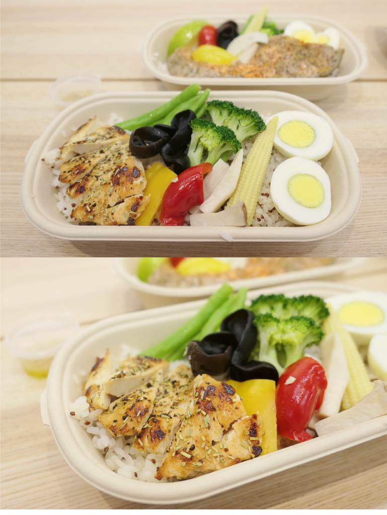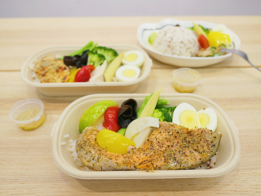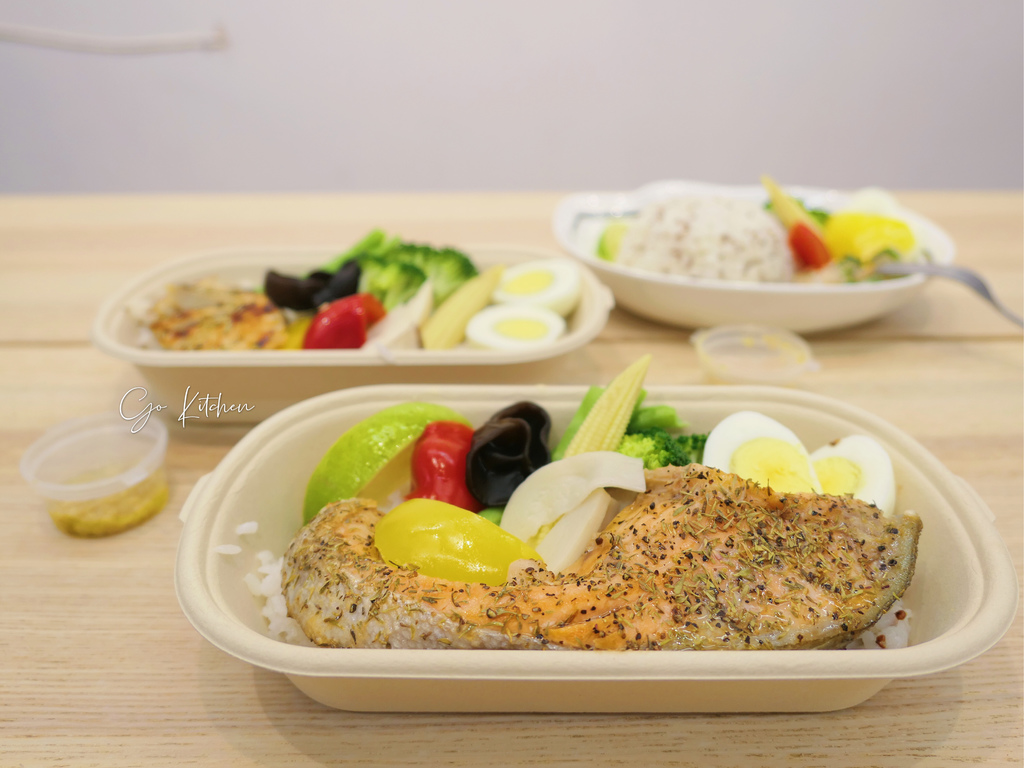 位於北投關渡站的「Go kitchen 來廚房」提供了煎香料雞胸、蒜蝦、鮭魚等菜色,提供給客人高貴不貴的健康餐盒選擇,也製造出與連鎖餐盒的差異性。