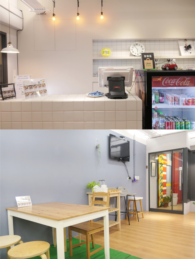 店內擺設沒有什麼多餘的裝飾,灰藍色牆面與鋪上綠色草皮的木地板,上頭擺放木桌椅,空間明亮而寬敞,相較一般較為狹小的健康餐盒店面來的舒適許多。