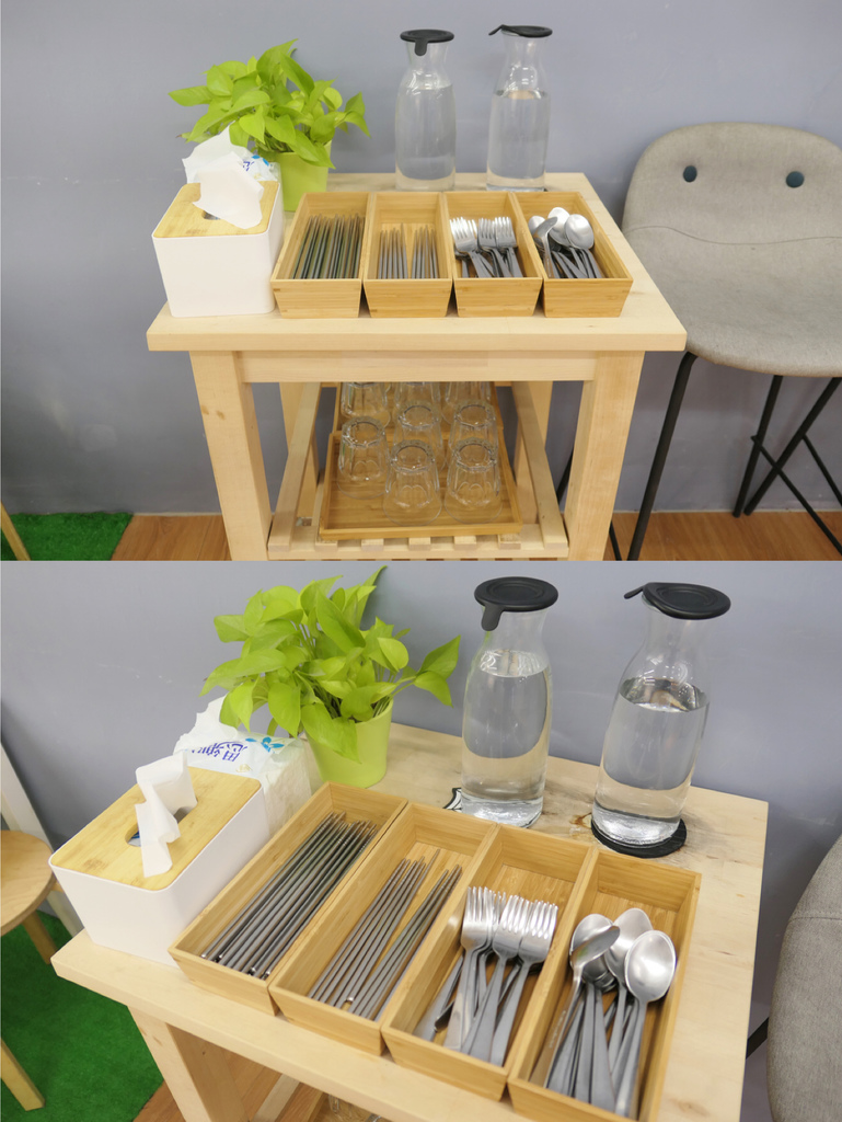 由於沒有酌收服務費,所以餐具皆為自取,店家也有提供白開水供客人飲用。