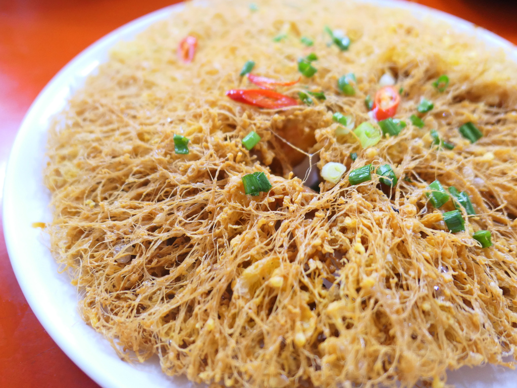 一份比我想像中大上許多,以大量細緻蛋絲裹取蝦子,在比例上蛋絲過多造成口感偏油,若不沾取醬汁則無味,吃多易膩,雖特別但稱不上好吃到驚豔。