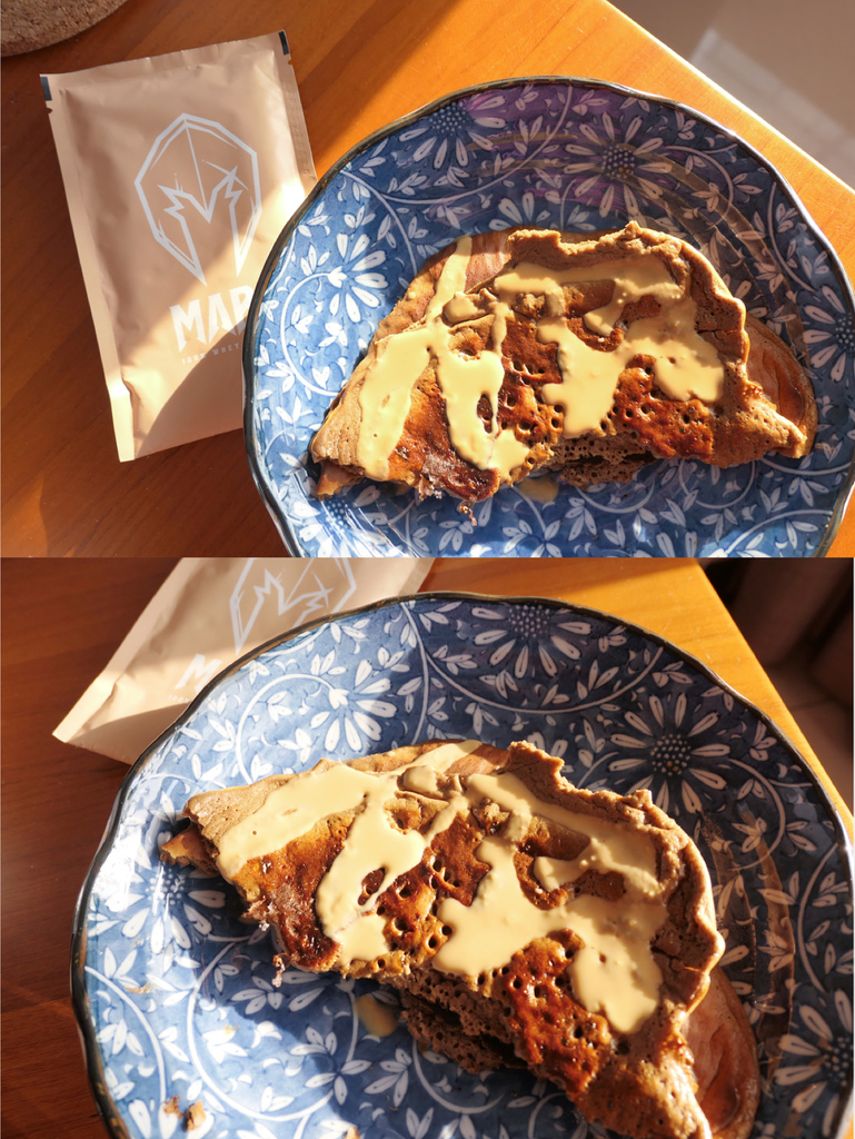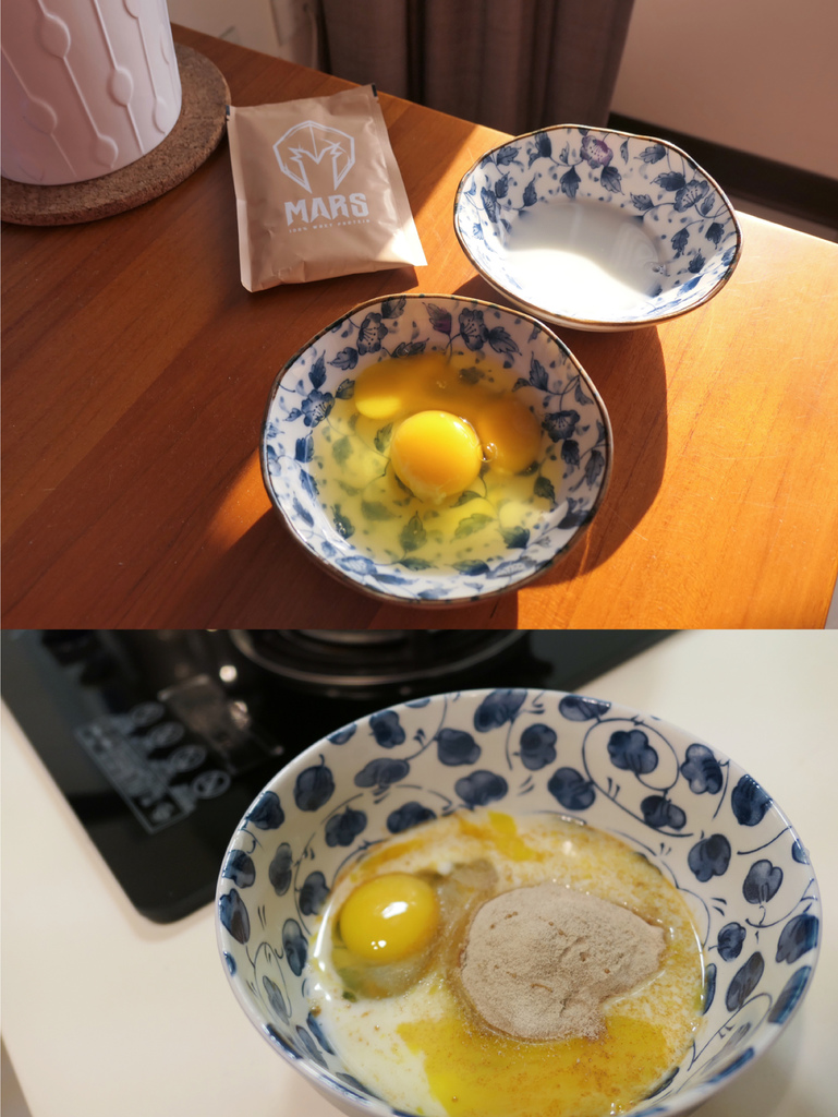 只要一包乳清蛋白粉、少許牛奶跟兩顆蛋,混合之後在平底鍋上煎熟就完成了,完全沒有技巧可言,過程也僅十分鐘不到。