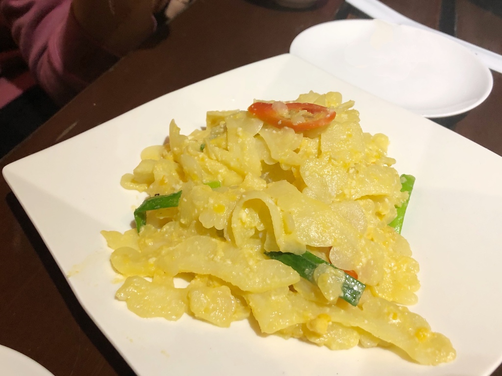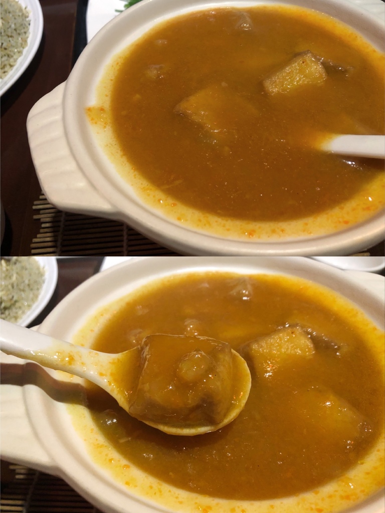 這道蟹黃豆腐的湯汁頗多,且有種玉米濃湯的偏甜感,拌飯還挺好吃的。