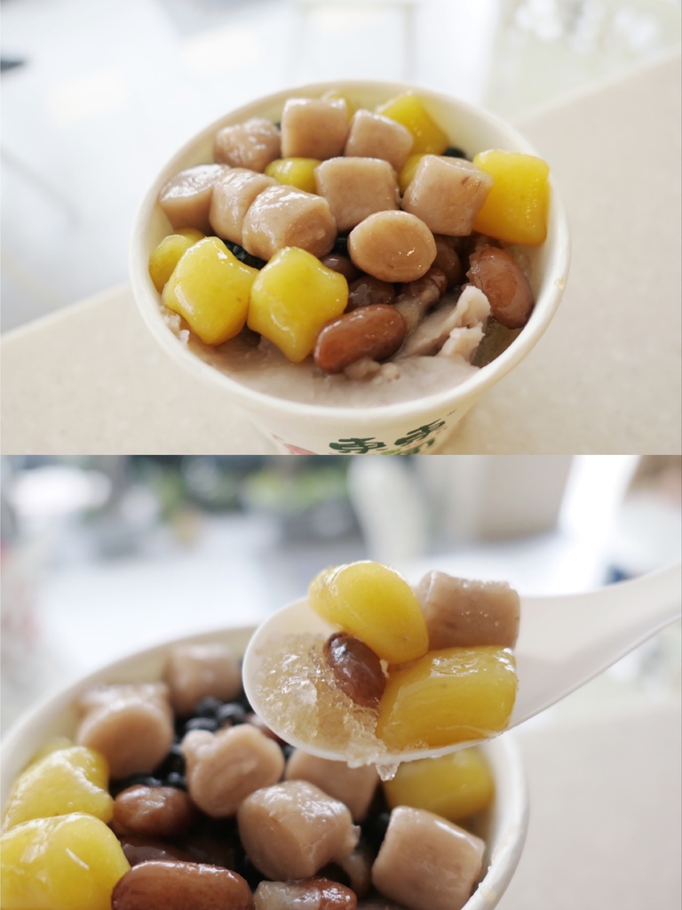 「東東芋圓」最知名的非芋圓跟蕃薯圓莫屬,個頭大且飽滿,遇冰後會隨時間口感更為Q彈,帶淡淡的芋頭及蕃薯香氣。