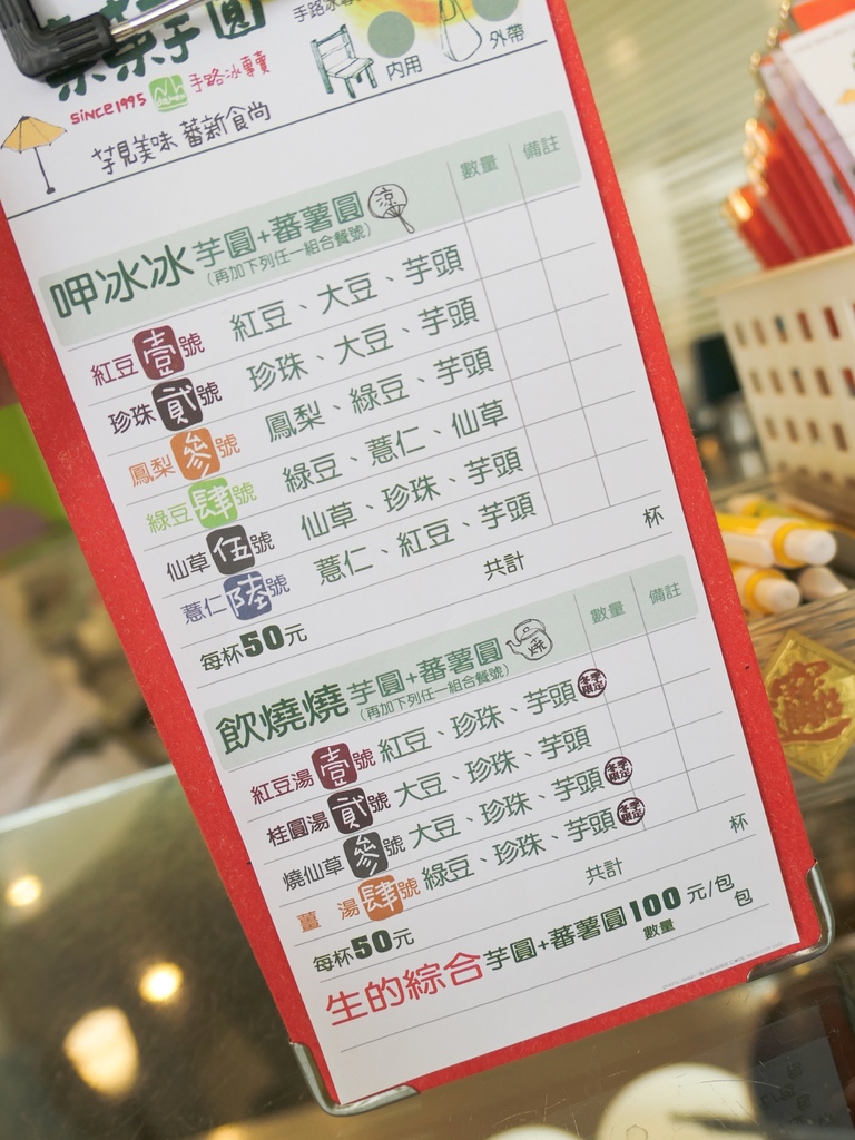 無論冷熱所有品項皆有芋圓跟蕃薯圓,而珍珠貳號的配料還有珍珠、大豆及芋頭。