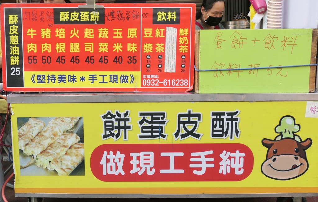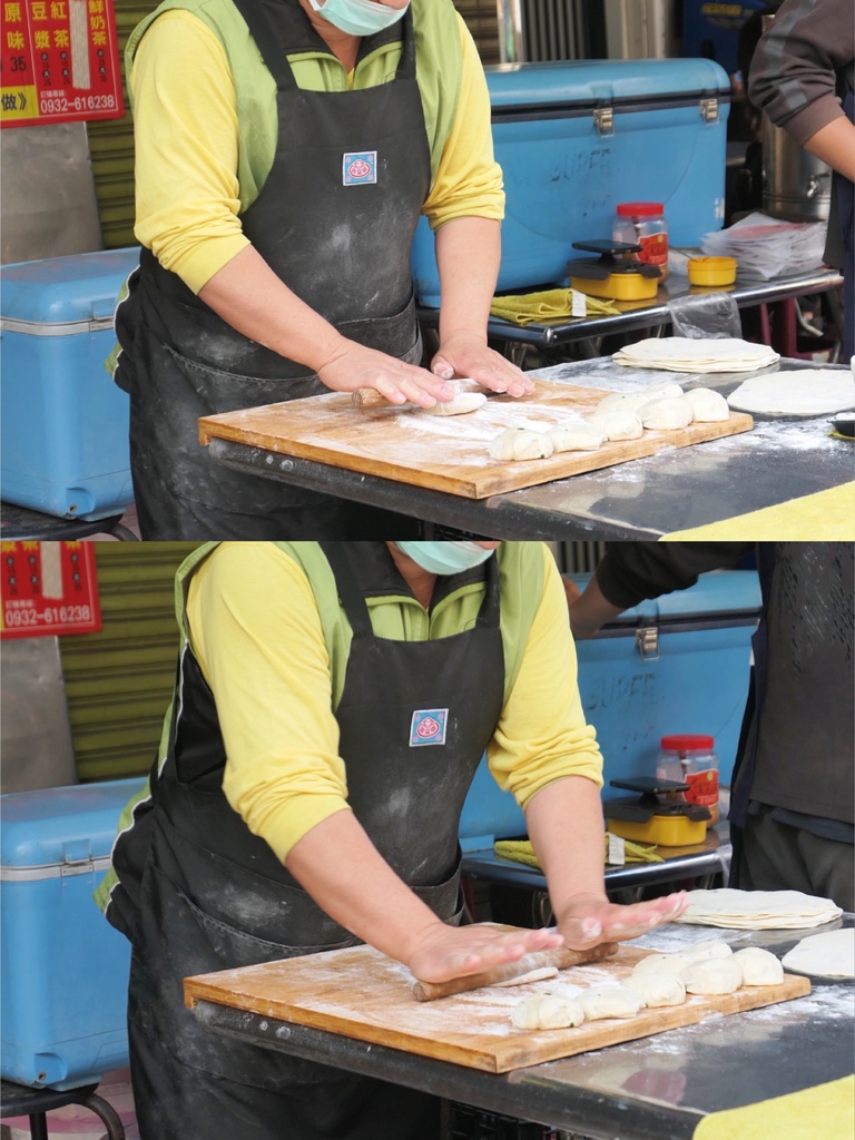 紅底的招牌,上頭自豪寫著純手工現做。老闆在一旁橄著麵團,搓揉後再一片片擀平再下鍋煎至焦香,讓我這蛋餅控忍不住口水直流,因為外酥內Q軟的餅皮口感是我的最愛。