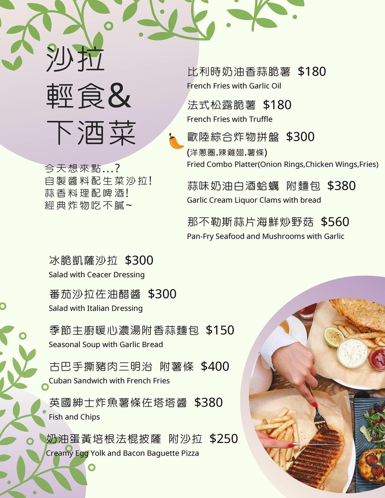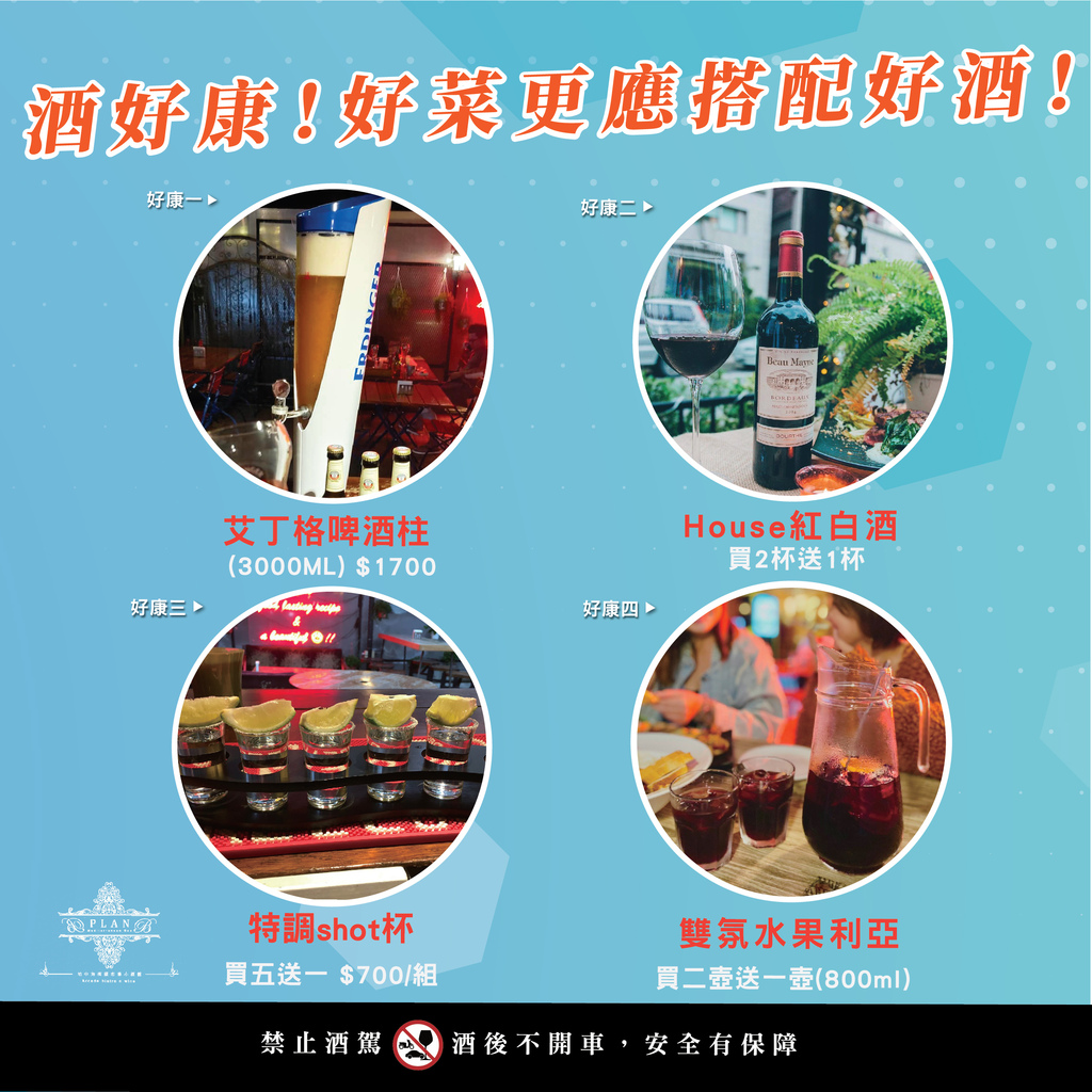 「Plan B 歐陸街頭市集小酒館」不定期會有優惠活動,下午茶或是正餐應有盡有,可以滿足各時段的消費需求。而酒類則是專屬於成人的,城市逃跑計劃。