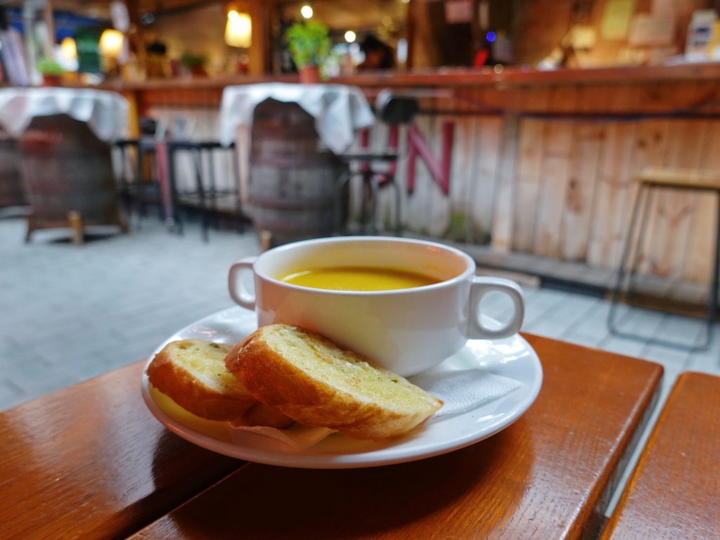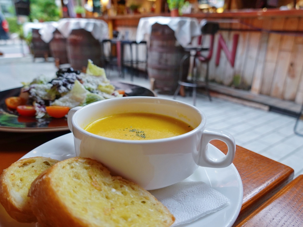 當天的湯品是南瓜濃湯,是一如既往的自帶溫柔甜味,一旁還有附上法國麵包,可單吃或浸泡在濃湯內食用皆很合適。