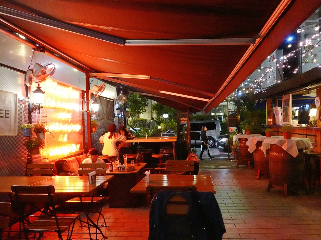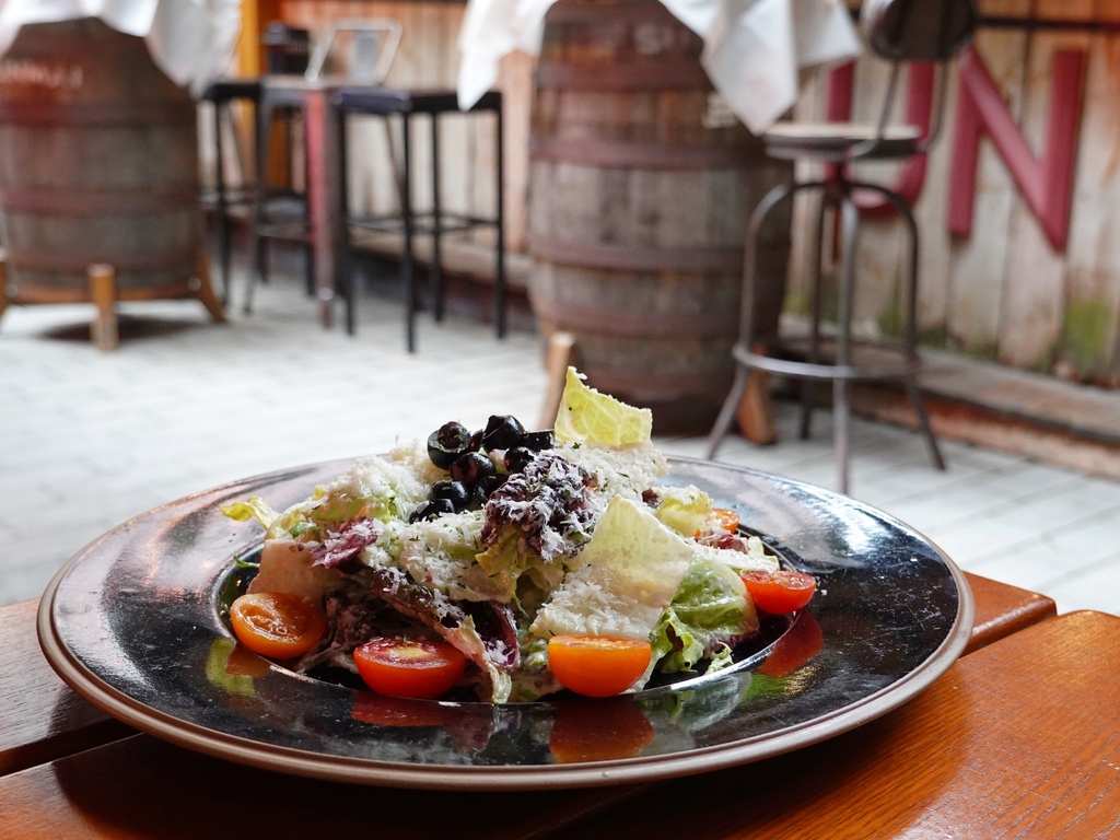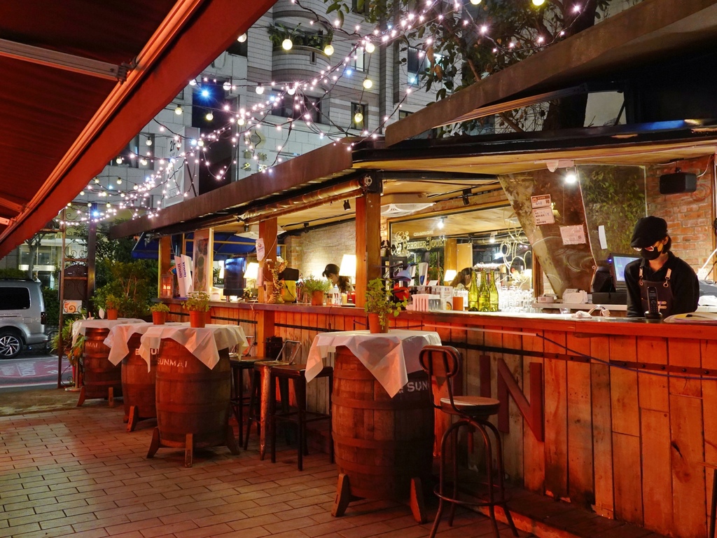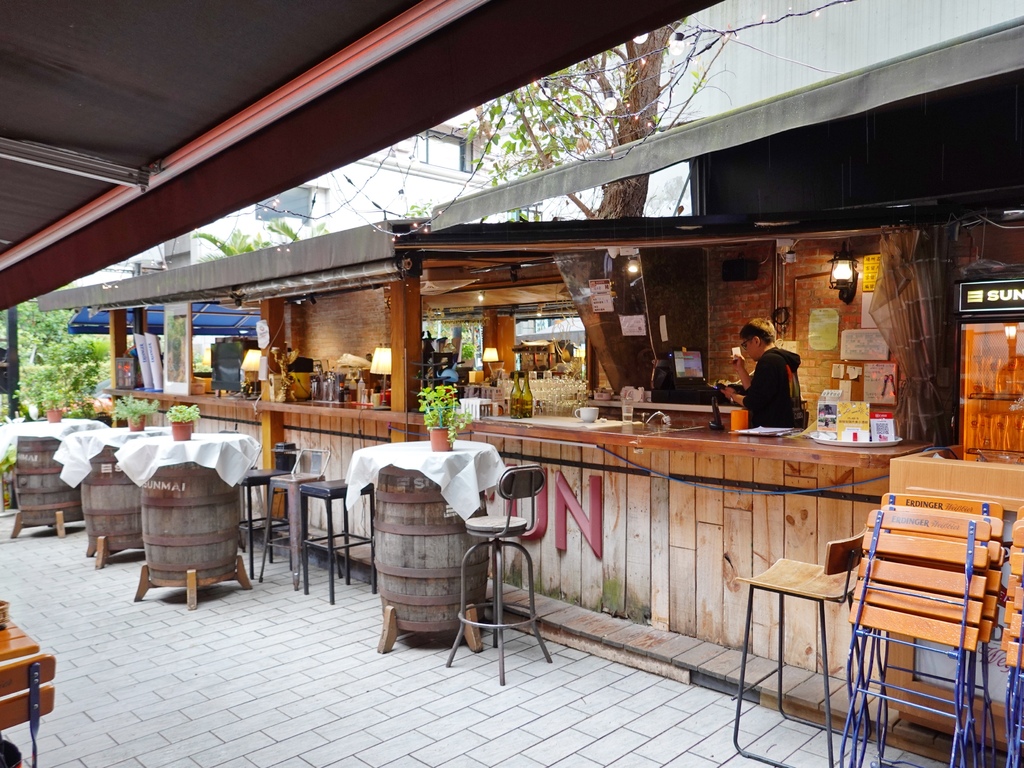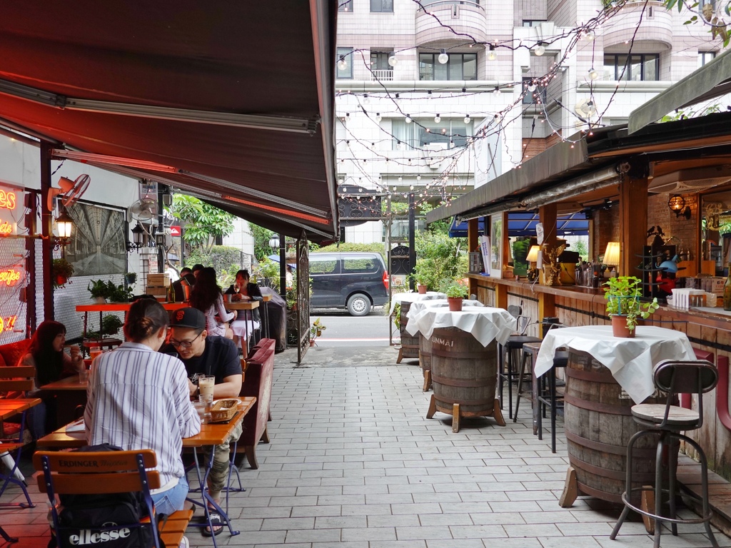 以木酒桶做為桌子,無論駐足立飲,或是慵懶的且站且坐在高腳椅上,都何嘗不是種享受。如果不巧遇到下雨天,有遮雨棚的半露天座位就是個好選擇。