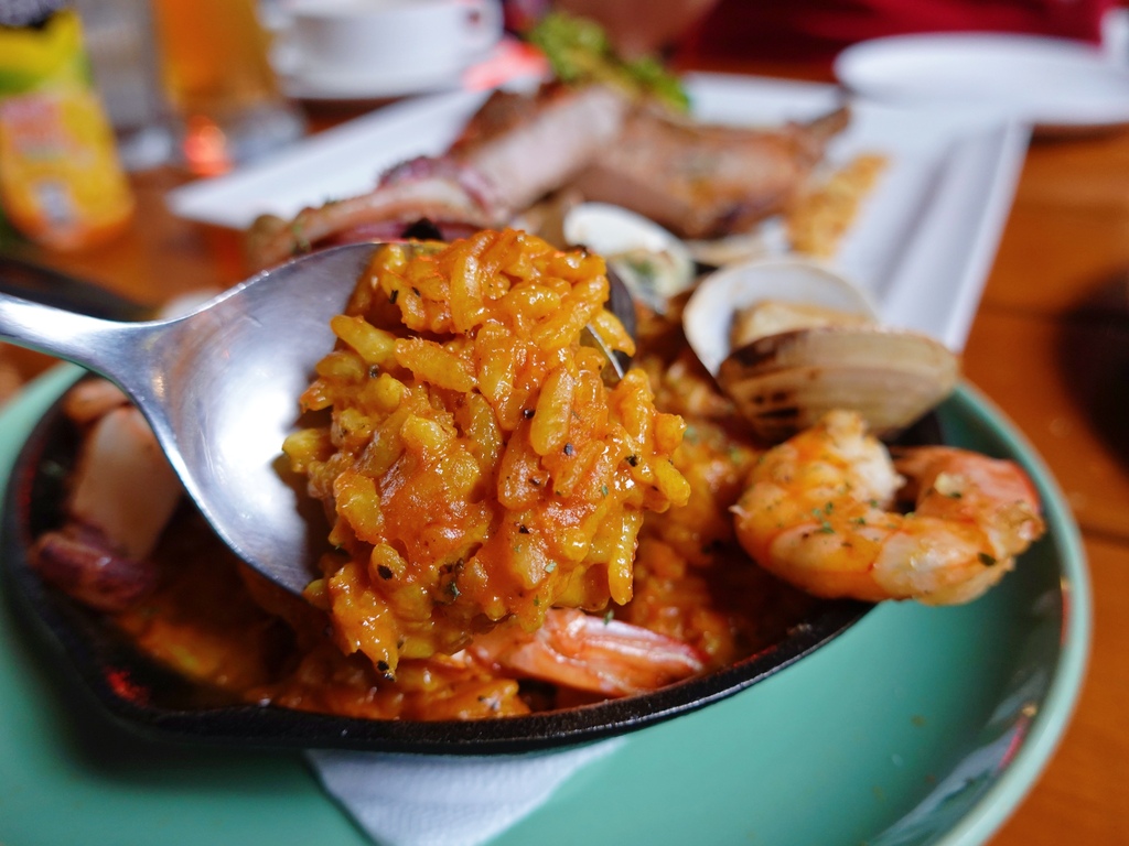 米飯帶些米芯口感,主要使用番茄與番紅花製成的醬汁,呈現鮮豔的橘紅色澤,原本的海鮮鹹味與酸度搭配得宜,夠味卻適時保有清爽度,不會過於負擔膩口。