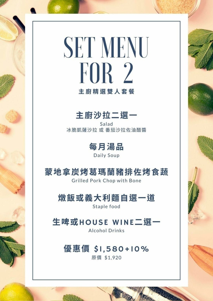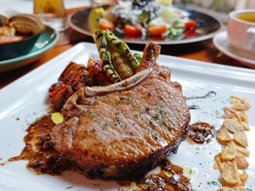 ▲蒙地拿炭烤葛瑪蘭豬排佐食蔬(主廚精選雙人套餐 $1280+10%)