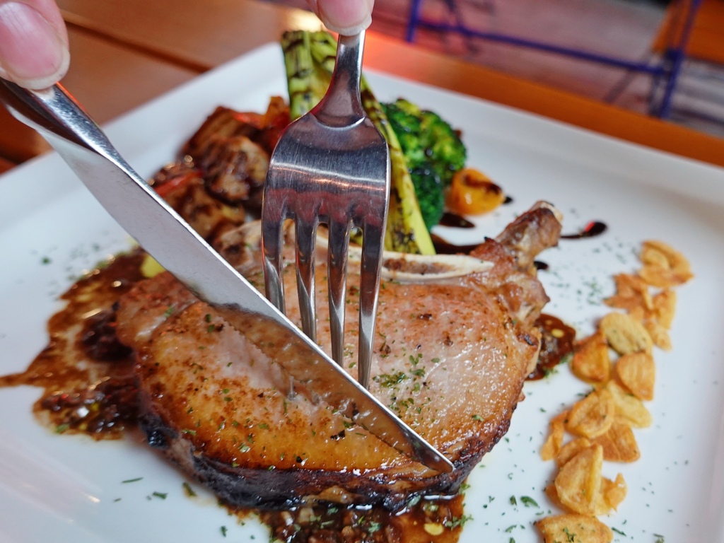 原本其實有些害怕如此厚實的豬排會不會肉質乾柴堅韌,但下刀分切時的彈性,證明煎烤火侯拿捏的恰到好處。