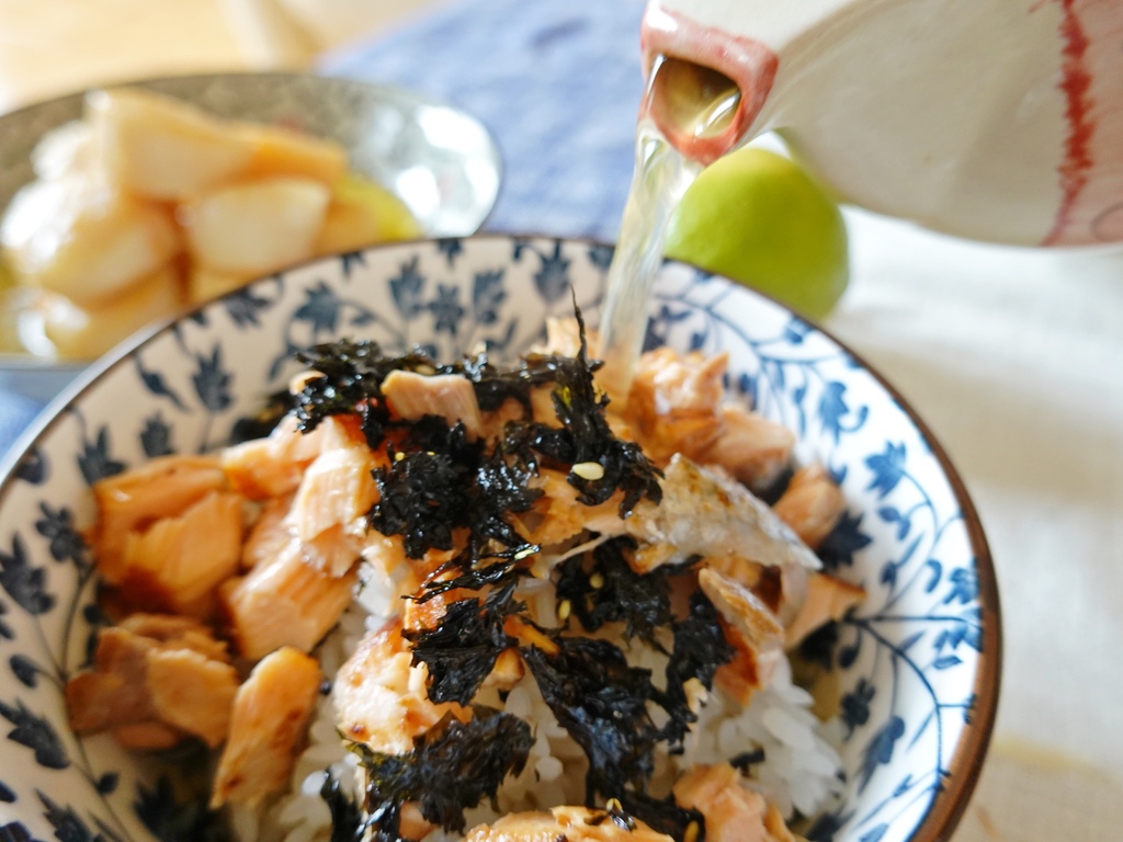 ▲STEP3:將鮭魚撕成塊狀置於白飯上,倒入柴魚昆布高湯,上方撒上海苔或香鬆