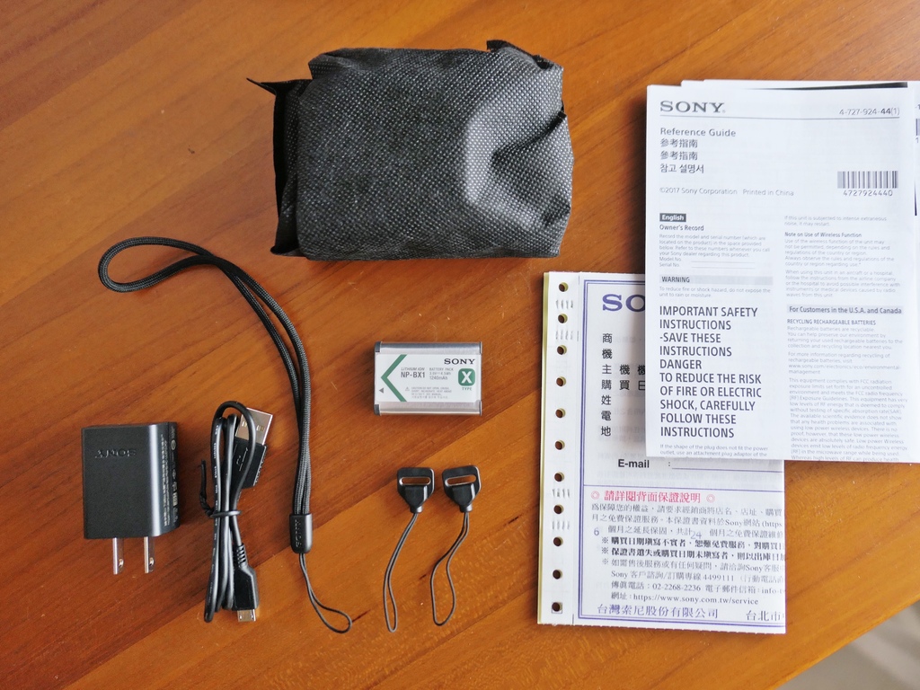 相機包裝內容含:可充電電池組 (NP-BX1) 、AC 變壓器、Micro USB 線、手腕帶及相機帶轉接環。