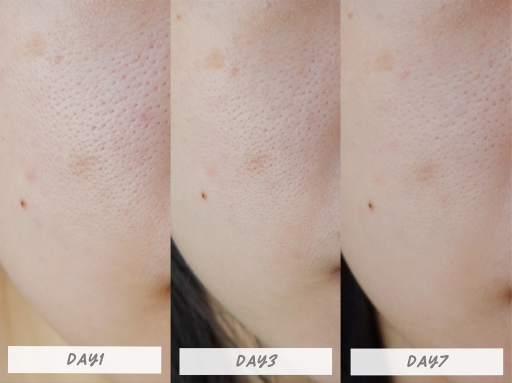 口罩痘而留下的痘疤,在使用小黑瓶七天後有明顯的變淡,幾乎光滑度及亮度也有提升。