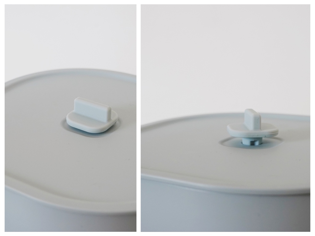要密封時,就將上頭的矽膠氣閥塞壓下;要打開時就拉開至看到凹洞,使用上很便利。在進行加熱時,務必要將氣閥塞拉起,避免內部空氣壓力過大,長時間加熱就建議將便當蓋微開,避免危險。