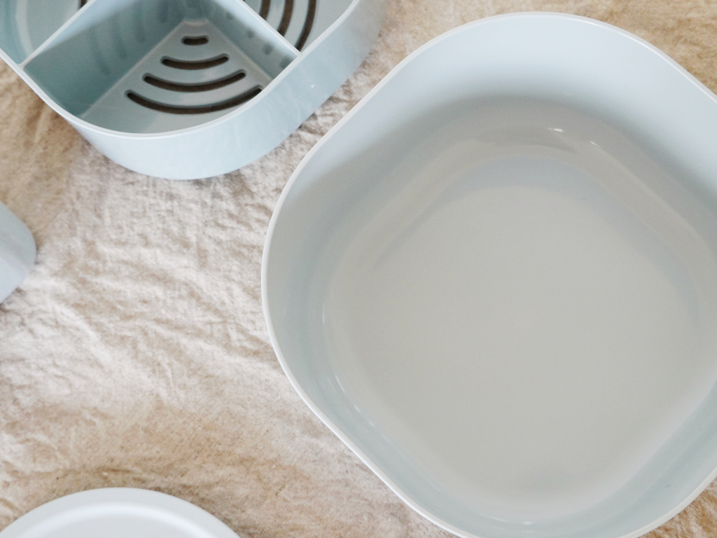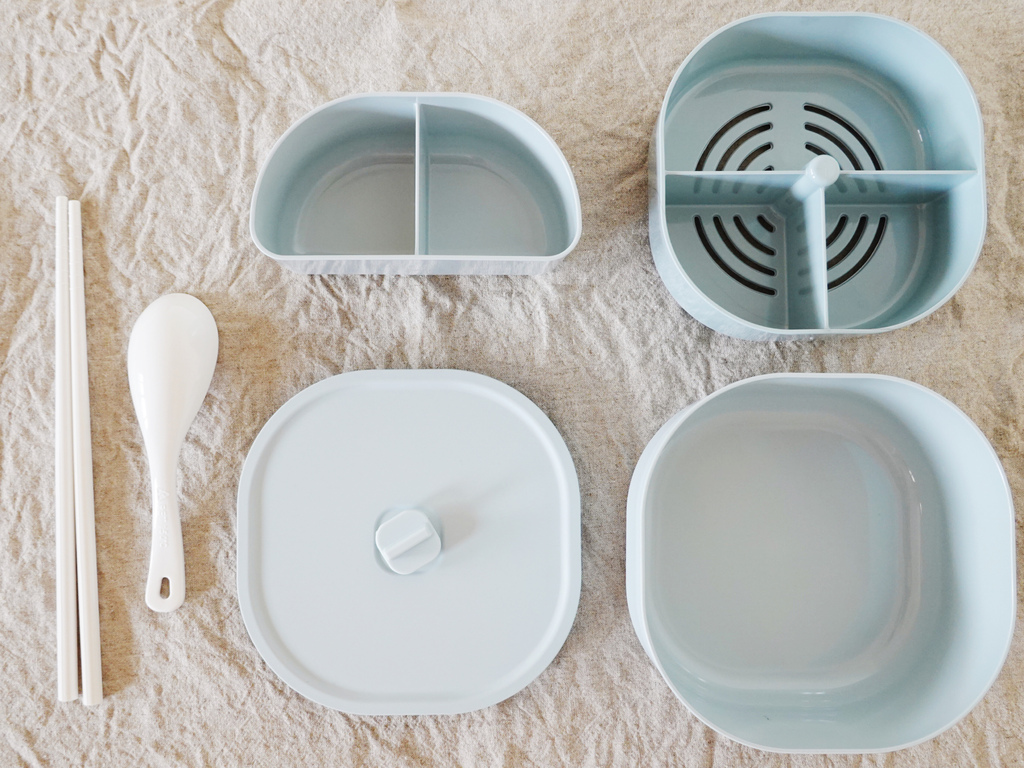 顏色有極簡白跟迷霧藍兩種選擇,迷霧藍相較於極簡白,有髒污、染色比較不明顯些,而且實品無論色澤跟手感都很有質感,使用漂亮便當盒吃飯食物都會增色不少。