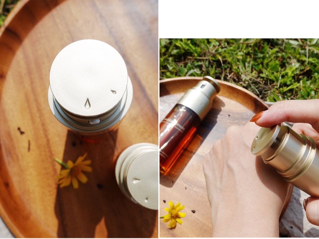 黃金雙激萃包裝設計的獨到之處,除了由瓶身即可見雙質地之外,還有客製化的旋轉式壓頭設計,上頭大滴小滴形狀,可以隨膚質、氣候等狀況依個人喜好調整。