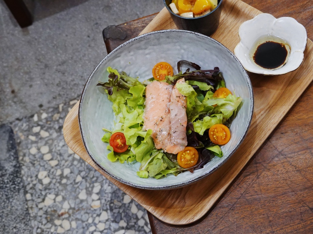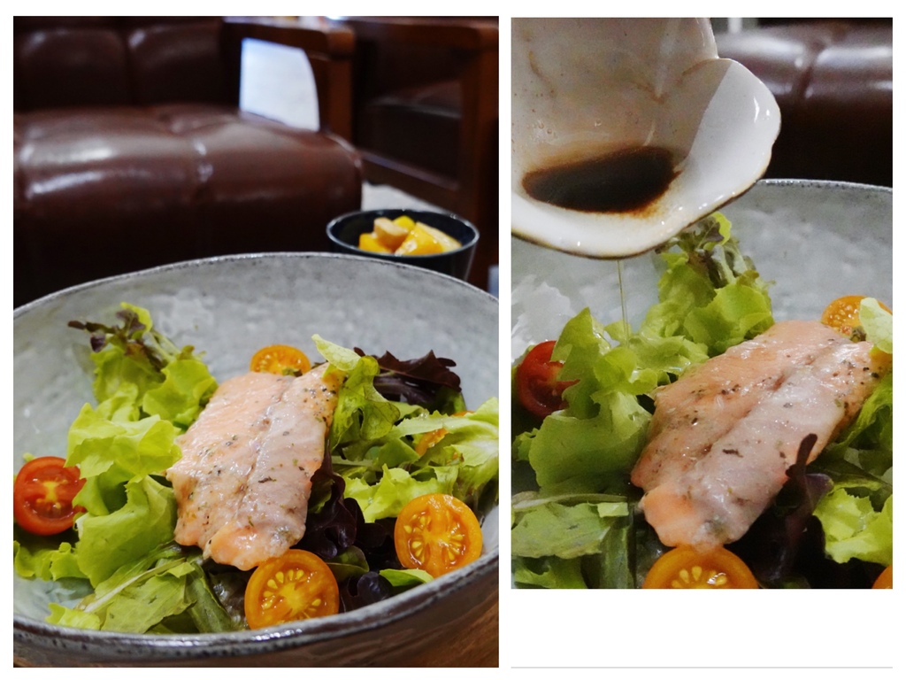 醬汁有優格醬還有油醋醬可供選擇,沙拉部分很新鮮爽脆,舒肥鮭魚有種半熟煙燻感,肥厚油脂為平凡的生菜增添不少風味。