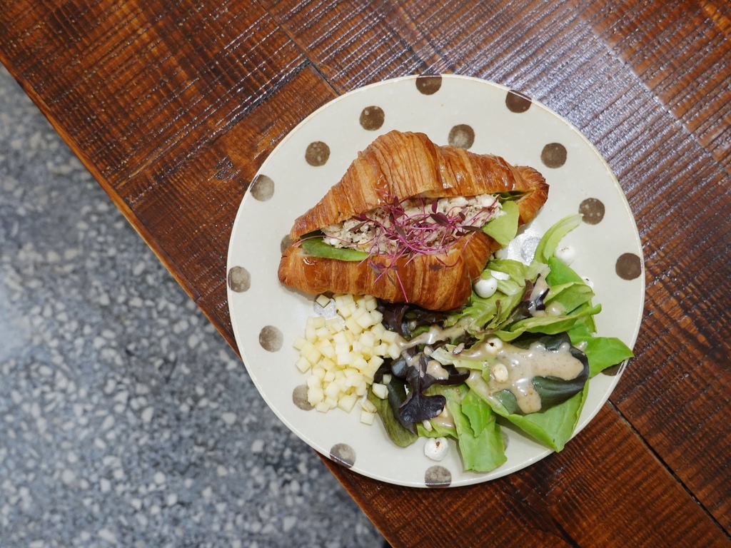 「餘生漫漫|輕食空間」的可頌是使用「MyCroissant by Guillaume 吉可頌丹麥專賣店」的可頌,旁邊還有些簡單的輕食配菜,當天是淋了胡麻醬的生菜沙拉跟蘋果丁。