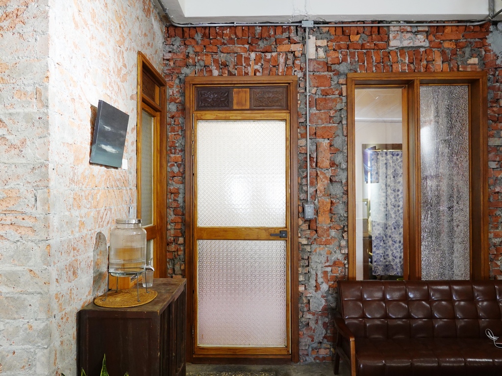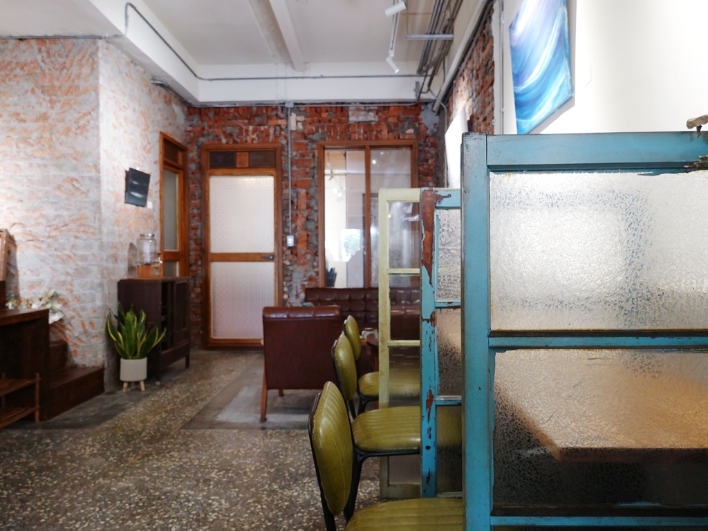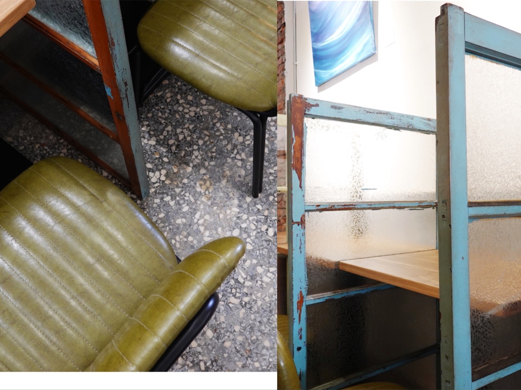 紅磚牆、磨石子地,並以竹青色的皮椅、懷舊的木板凳當作座位,我最喜歡的,則是以斑駁花窗框作為座位間隔,很有童年時老家的既視感。