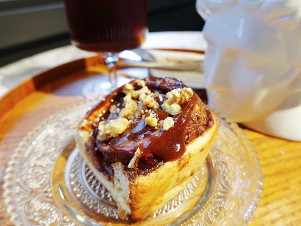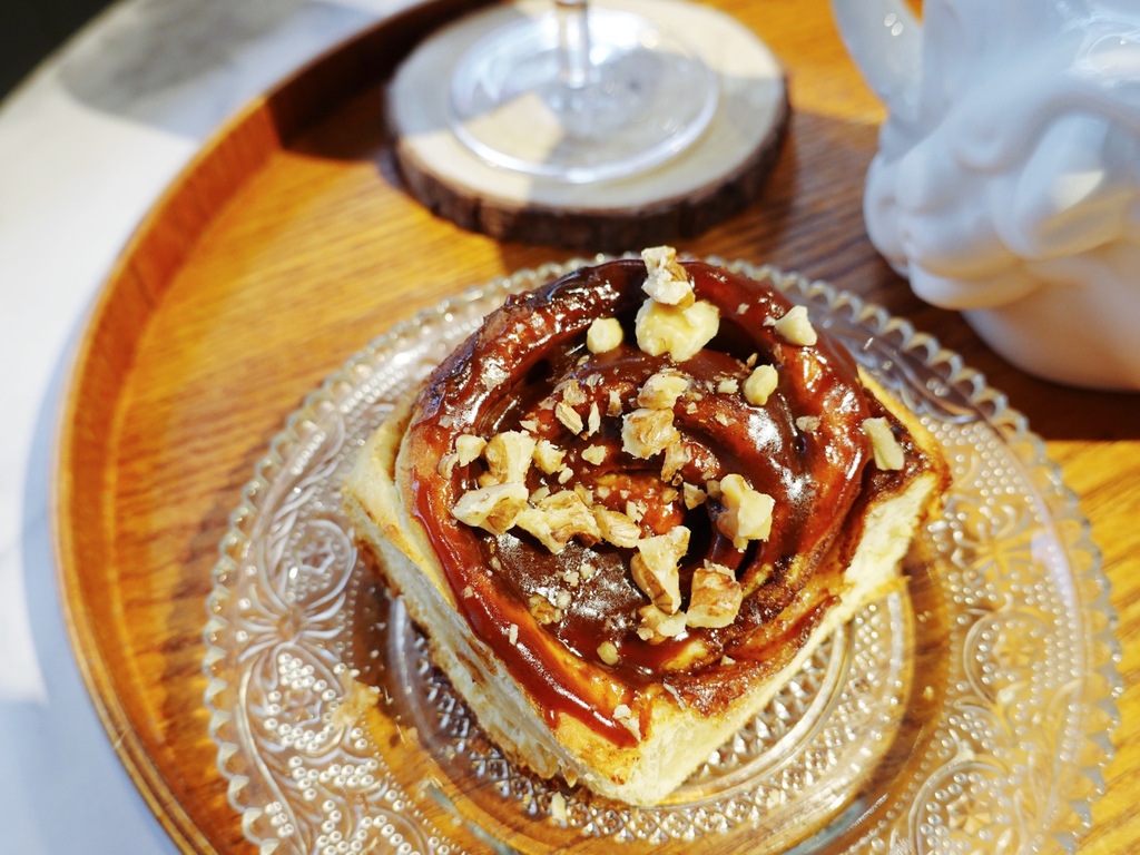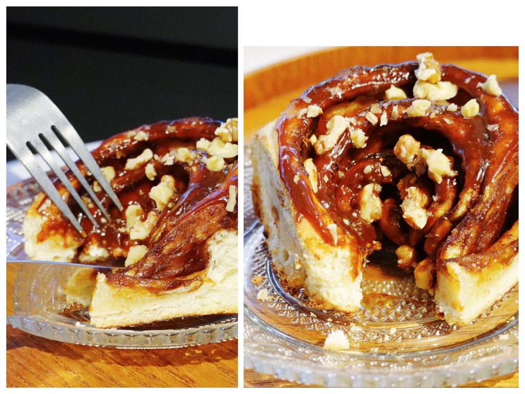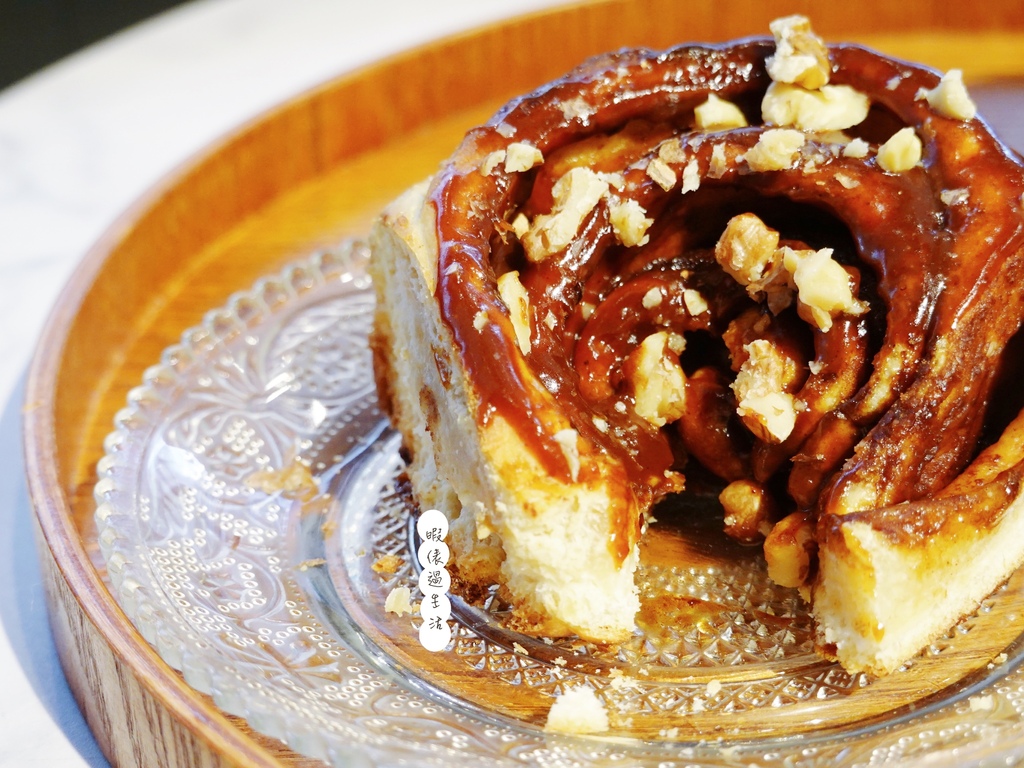 酥脆的麵包體、不過於猖狂的肉桂焦糖醬、富口感的堅果細碎,以外觀來說真的是挺不賴的。