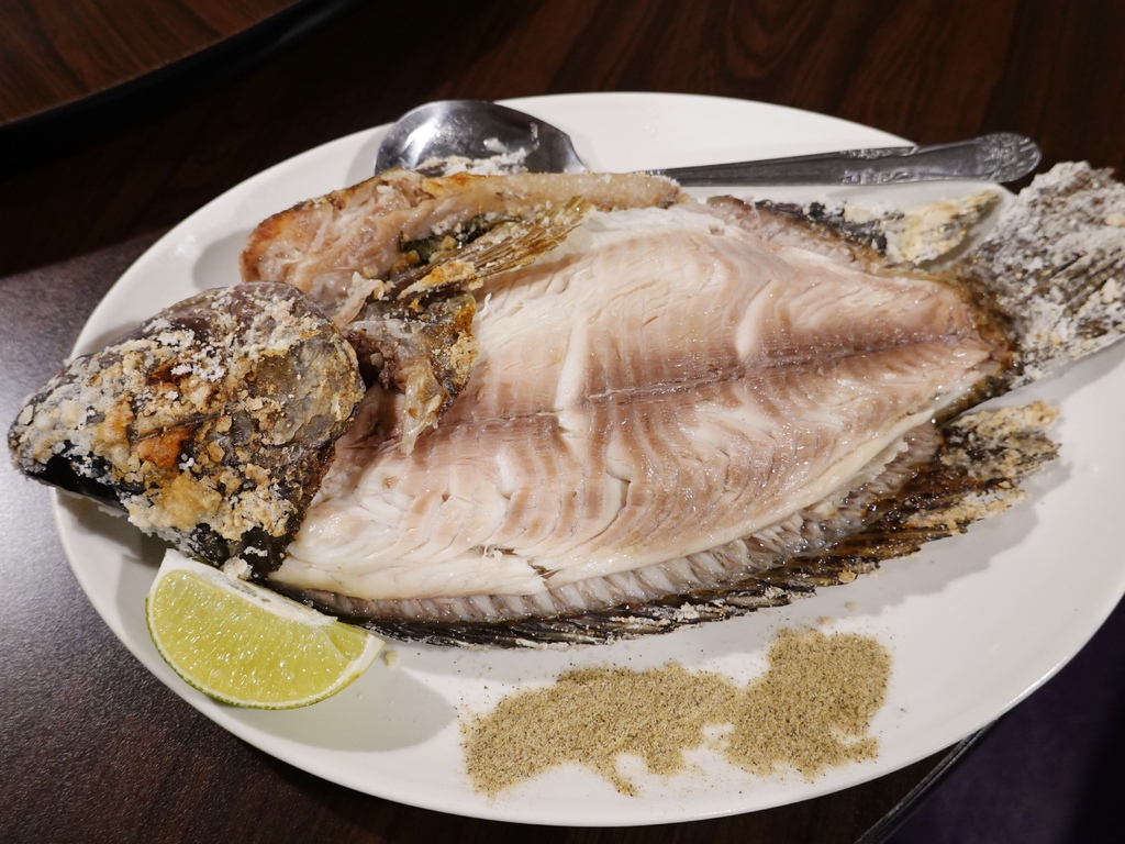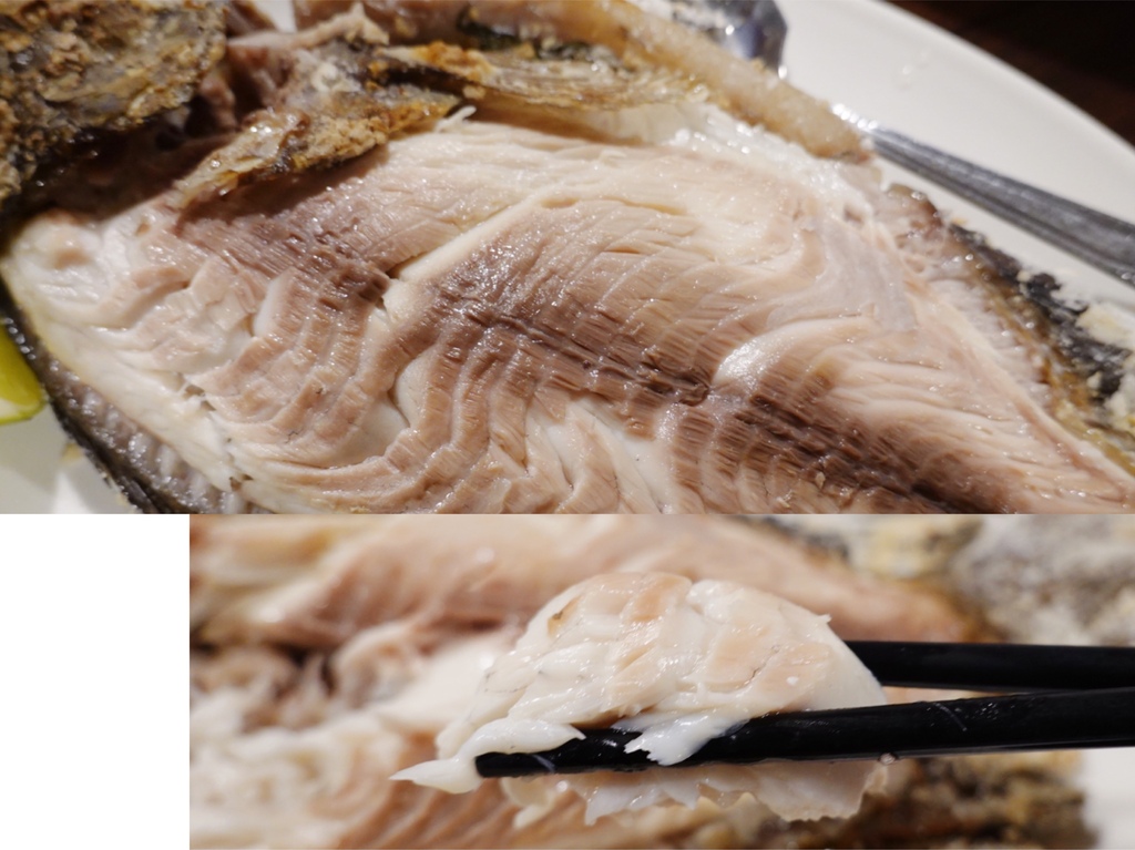 撥開以鹽巴包裹燻烤的外皮,裡頭是閃爍油亮光澤的魚肉,賣像極佳。