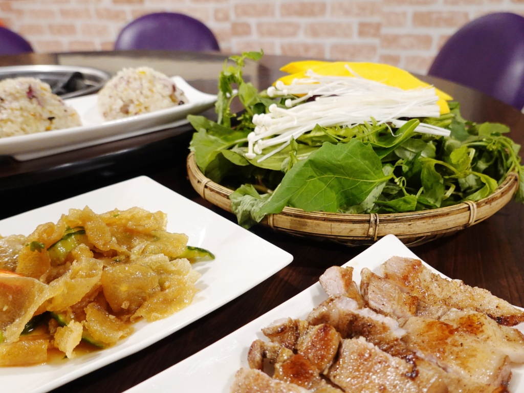 套餐內容:野菜鍋、石板烤肉、涼拌山豬皮、養生飯