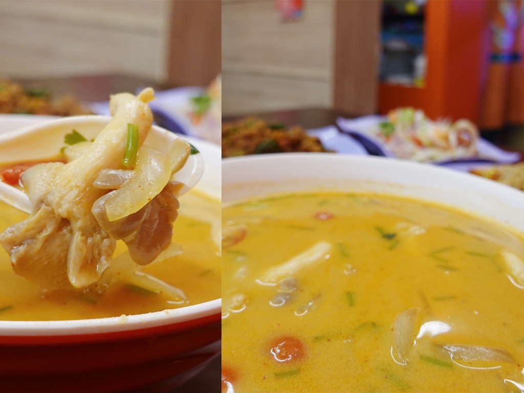 裡頭除了蝦、花枝、蛤蜊等海鮮之外,還有香菇、洋蔥、番茄、鴻喜菇等蔬菜,豐富的材料外還有滿滿的椰奶及辛香料味,一大碗可以兩三人分食,挺划算。