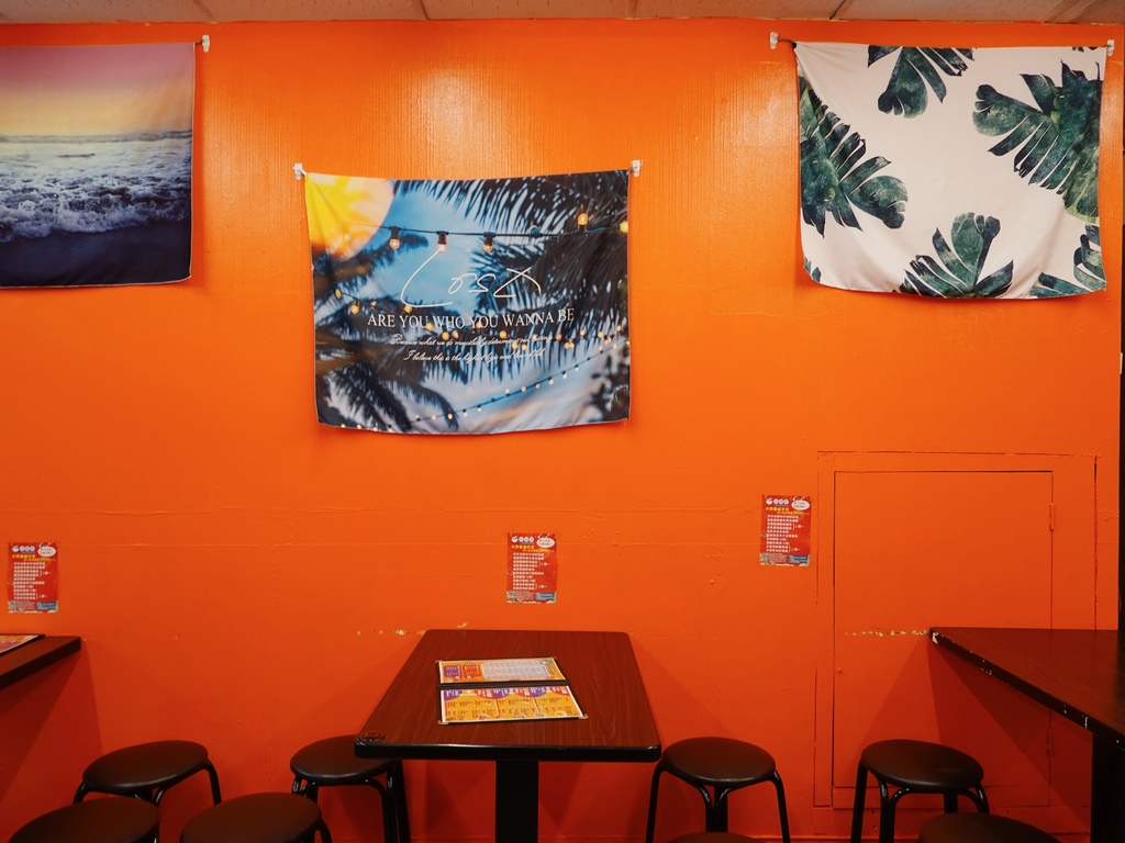 牆面漆成泰式奶茶般的亮橘色,使用了帶有南洋風情的擺設及布簾,讓簡單的店面多了些異國情調。