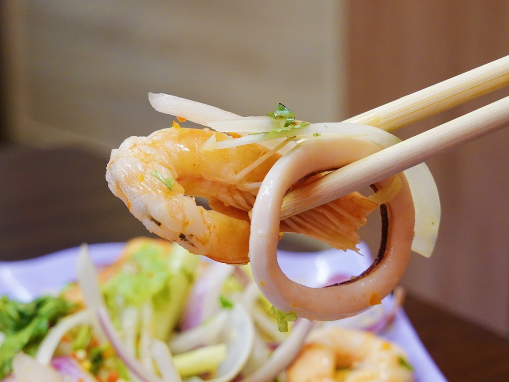 海鮮是使用急速活體冷凍白蝦及魷魚,還很貼心的去殼方便食用,但比較可惜的是醬汁較沒有入味。
