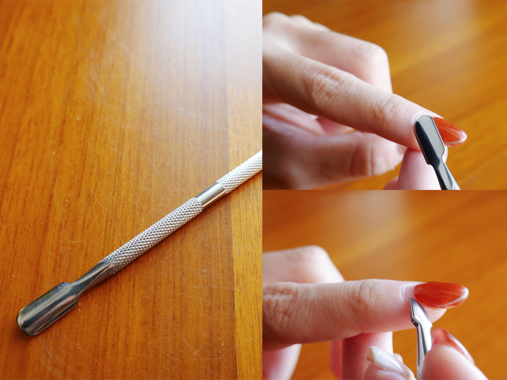 同樣是光撩組內附的鋼推刀,雙頭有著不一樣的功能。平頭可以去除指緣的死皮,可用於光撩的前置作業;而刀頭則是可以用作輔助卸甲。