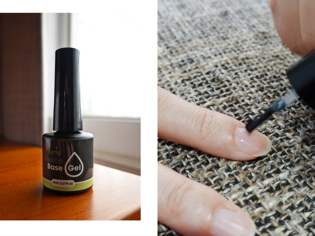 將剝剝底膠薄刷在指甲上,但切記範圍不要太靠近指緣,也不能包邊,不然光撩會很容易脫落。