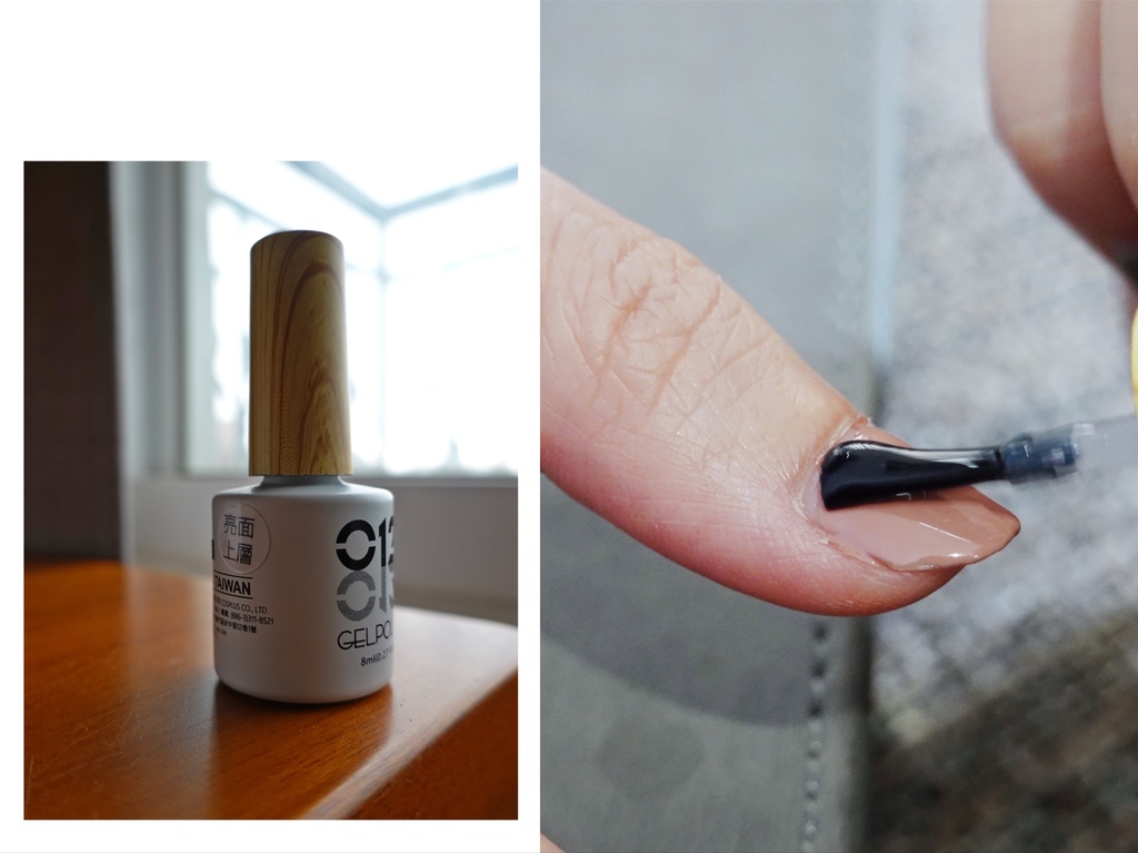 最後一個步驟,是塗刷亮面上層膠,這和底膠以及甲油膠比較不一樣的是,需要包邊以及照到乾,大約需要三到五次的照燈,直到甲面全乾為止。